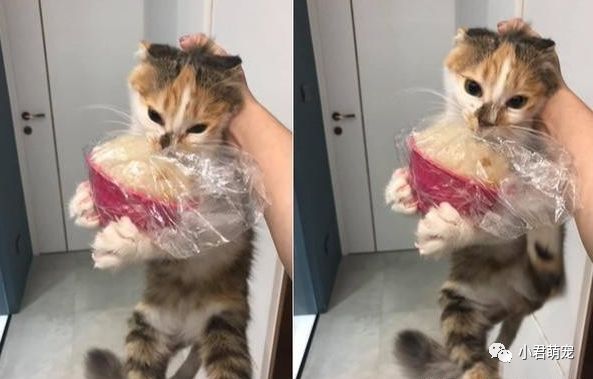 猫咪嘴里的肉掉在了地板上,宠主就把猫咪放下,准备拿纸巾把肉捡起来,清理一下地板。但是,就在宠主转身的功夫,猫咪就直接把桌子上的另外一个食物咬在了嘴里,是一小碗米糕。 宠主再次拎起来猫咪,猫咪故技重施用爪子捂住,不让宠主枪,但最后还是抵不过宠主,到嘴的食物又没有了。