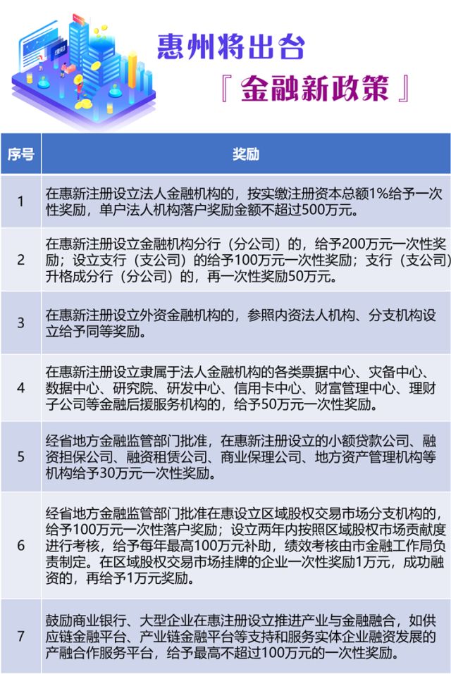 为了鼓励各种新兴的金融业态到惠州发展,惠州将针对相关金融机构的落地,给予1万至100万元的奖励。