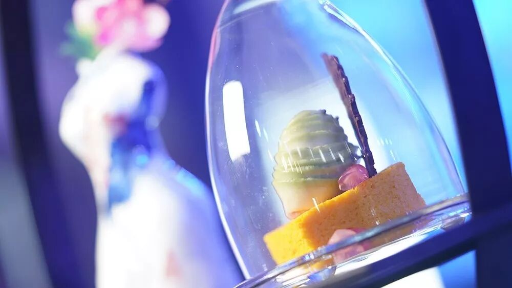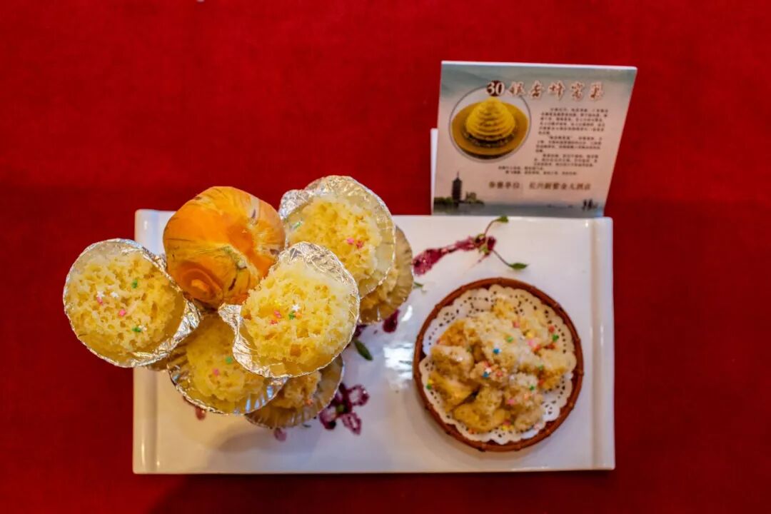 银杏蜂窝巢用鹰栗粉、吉士粉、生粉和蛋黄调和均匀后,入油锅炸成蜂窝状,出锅前撒上碎银杏肉和桂花糖。蜂窝层叠,似空中楼阁;银杏飘香,恍行走长兴大地。
