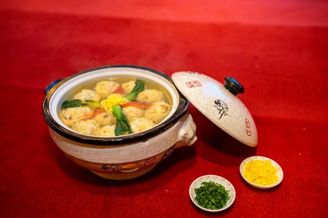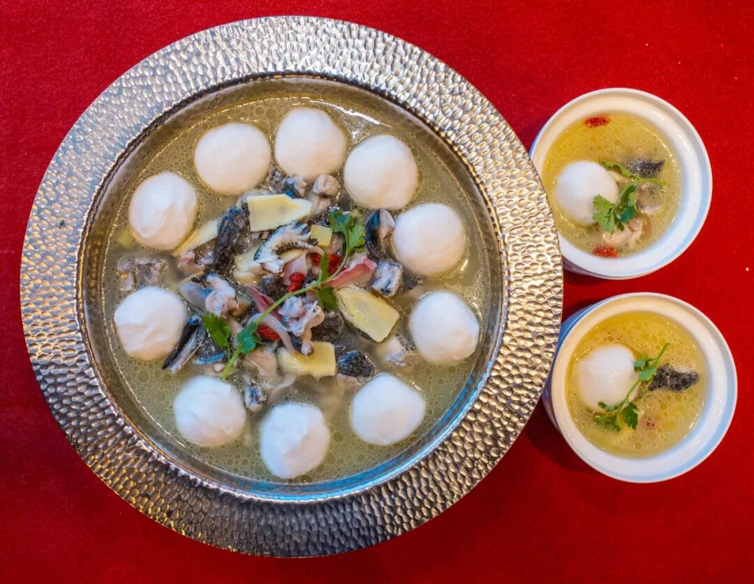 蟹粉鱼蓉狮子头在原淮扬名菜蟹粉狮子头的基础上加以改变,把猪肉改用鱼肉,更适合现代人健康饮食的诉求,蟹粉是太湖大闸蟹拆解而成,两者合一口感鲜香,是湖州地区每逢佳节庆典的一道重要菜肴。