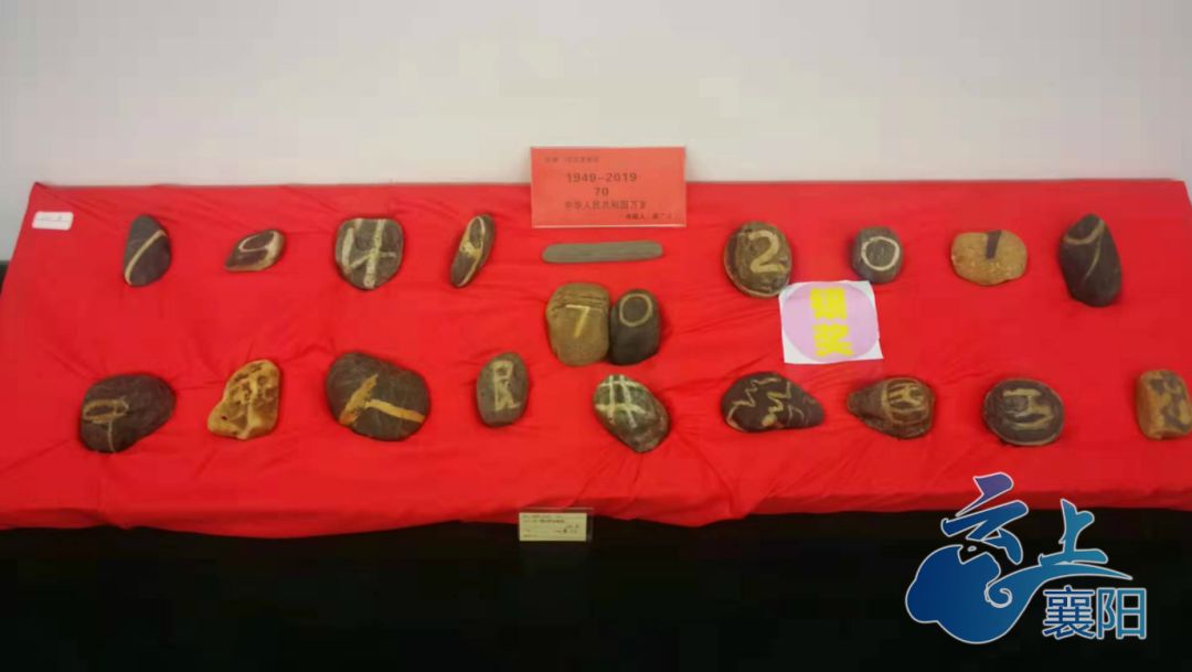 石友薛先生经过一年多的精心准备,于参展前将19块汉江文字石,组合成“1949到2019”以及“中华人民共和国万岁”一组文字。