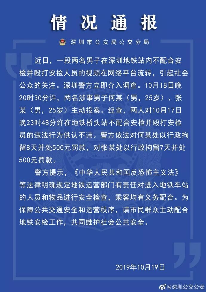 1.深圳地铁站两男子殴打安检人员,警方:已行拘 近日,深圳地铁11号线桥头站,两名乘客在进站时拒不配合安检,其中一名白衣男子将安检员摁在安检机器上,另一名白衣男子则持椅子殴打安检员。几名安检员上前劝阻,但仍未能制止两名男子施暴。深圳市公安局公交公安分局19日发布警情通报,两名男子已被行政拘留。(深圳公交公安微博)