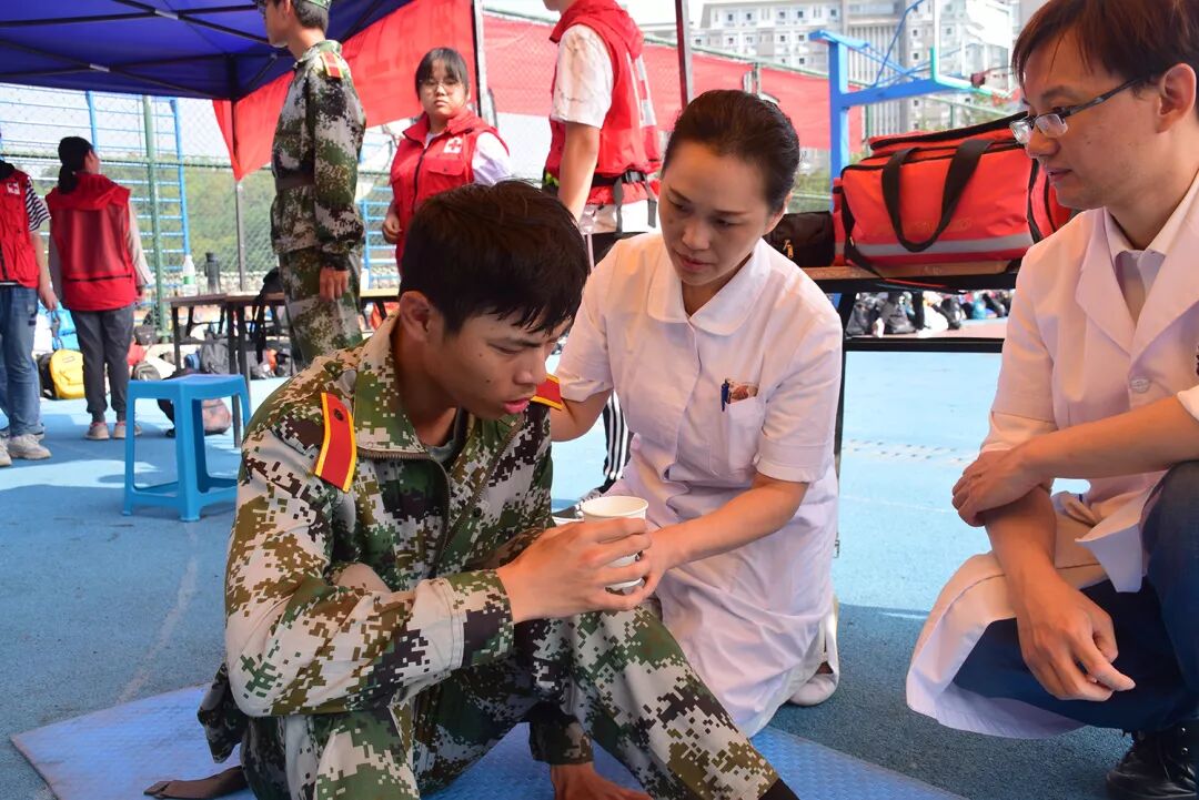 现场救护队队员们以高涨的热情和良好的精神风貌出色地完成了此次的新生军训保障任务,在实践中再次展现了“人道、博爱、奉献”的红十字精神,遇特殊状况冷静自持,为新生们的军训活动保驾护航!