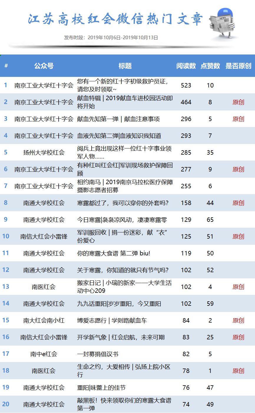 江苏高校红会微信公众号影响力排行榜[9月30日-10月6日]