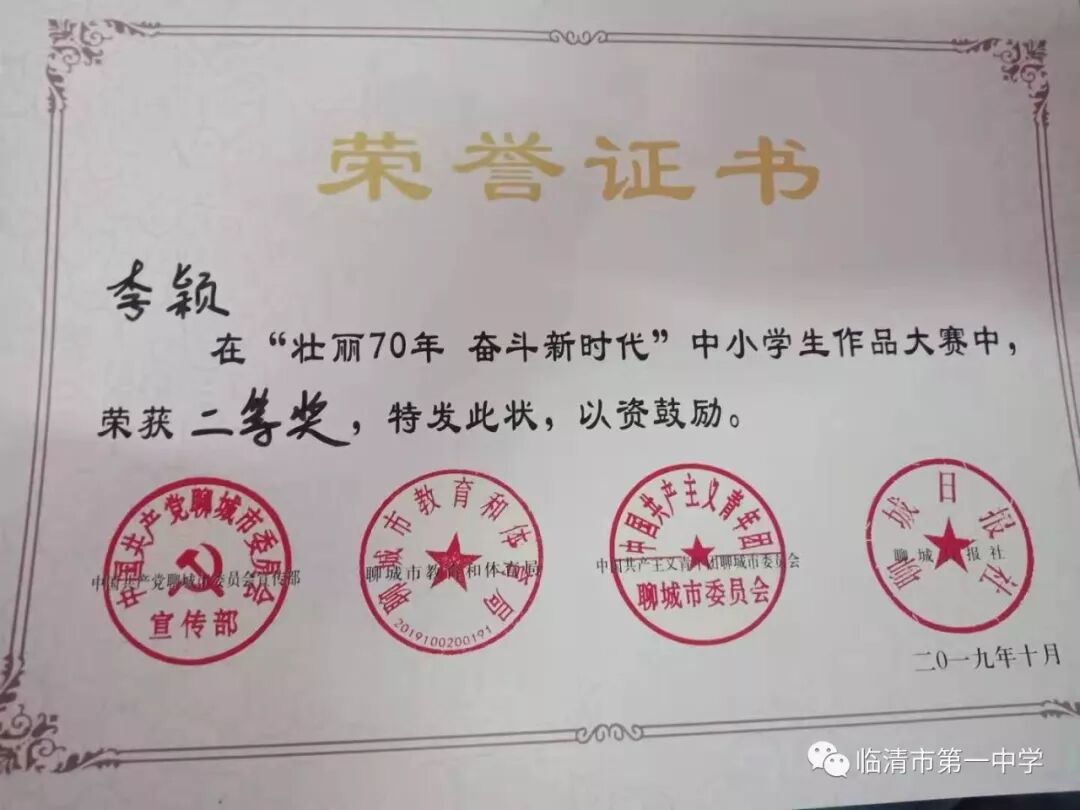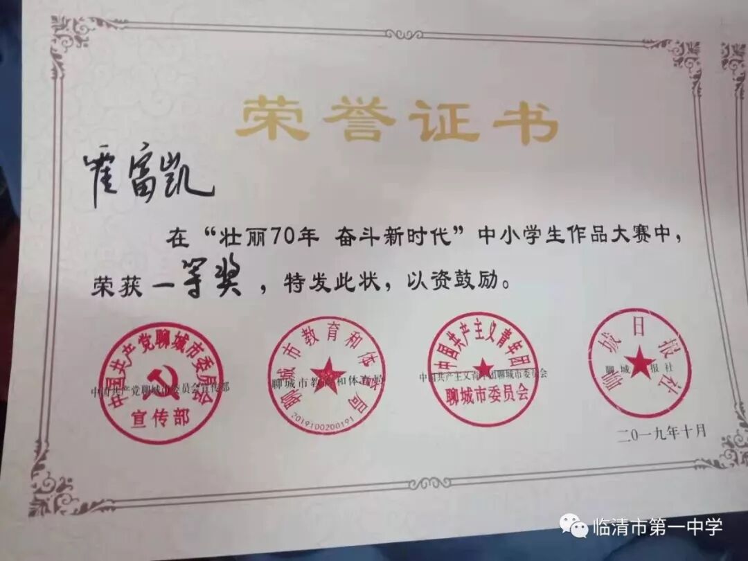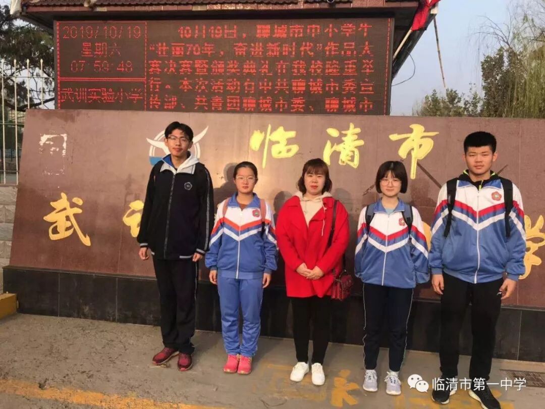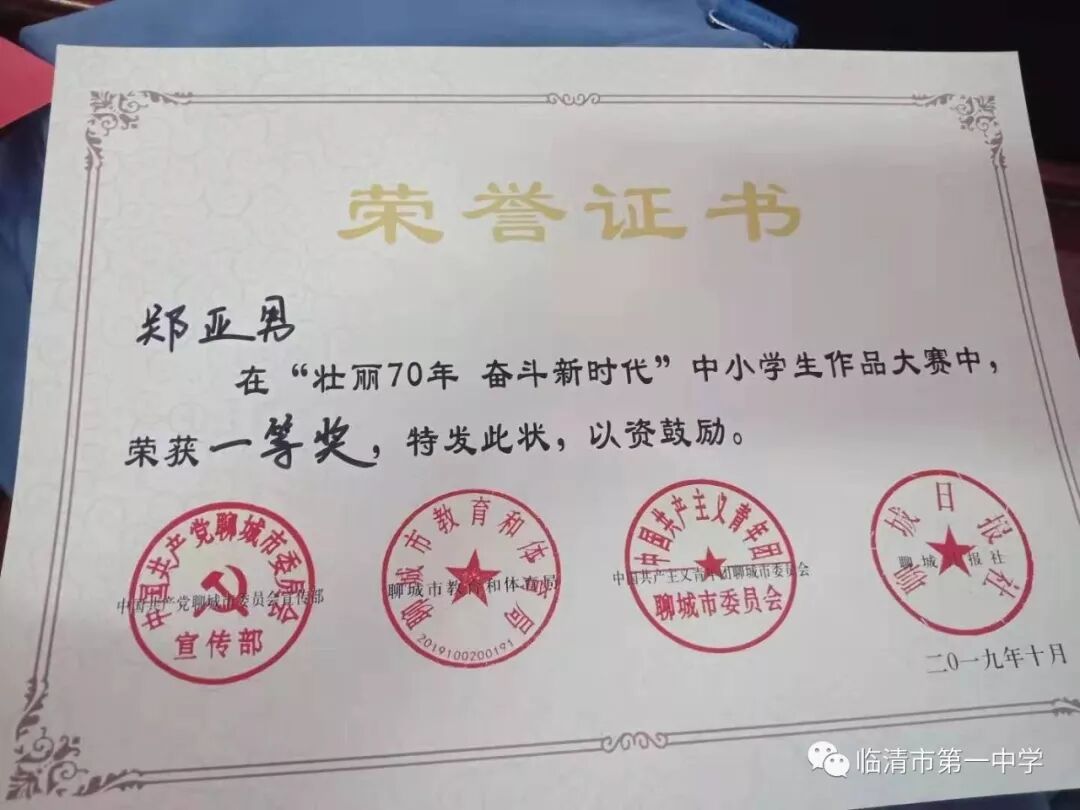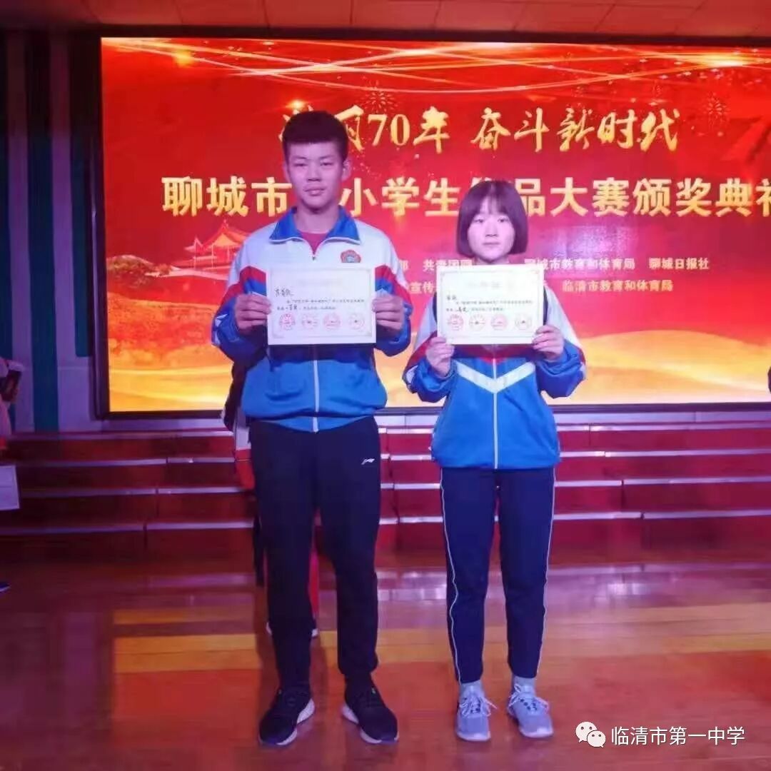 四位同学不仅代表个人和学校,更代表着临清,代表着家乡,他们用精美的文章和书画作品为新中国成立70周年献礼,对他们表示祝贺的同时,更祝愿我们的家乡更加美丽,祝福我们的祖国更加繁荣富强!