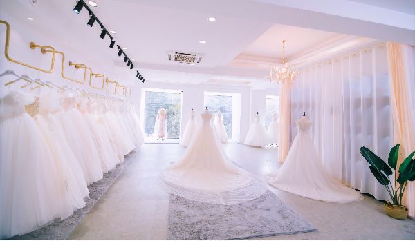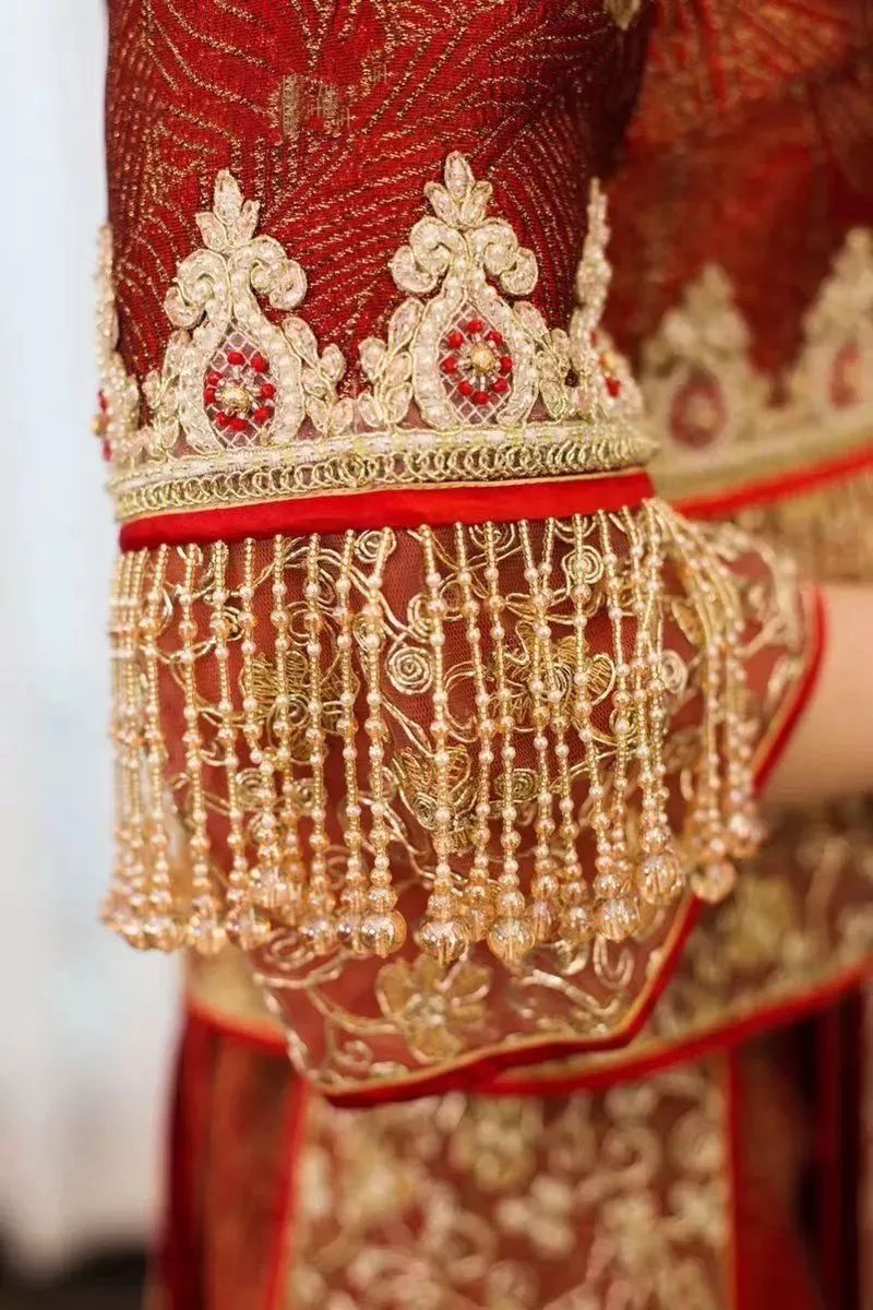 洁白柔软的婚纱和热烈红火的裙褂礼服像展品一般被安静地陈列在两侧。