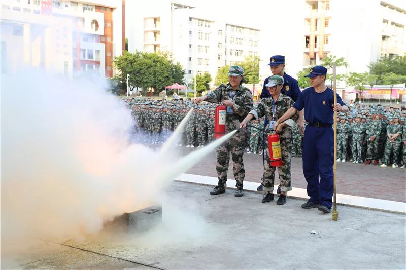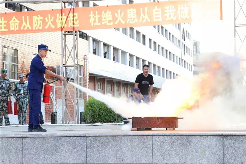消防员为师生讲解、示范灭火器、灭火袋、水枪的使用方法