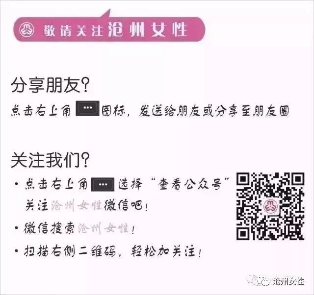搜索“沧州女性”微信公众号或长按二维码识别关注。