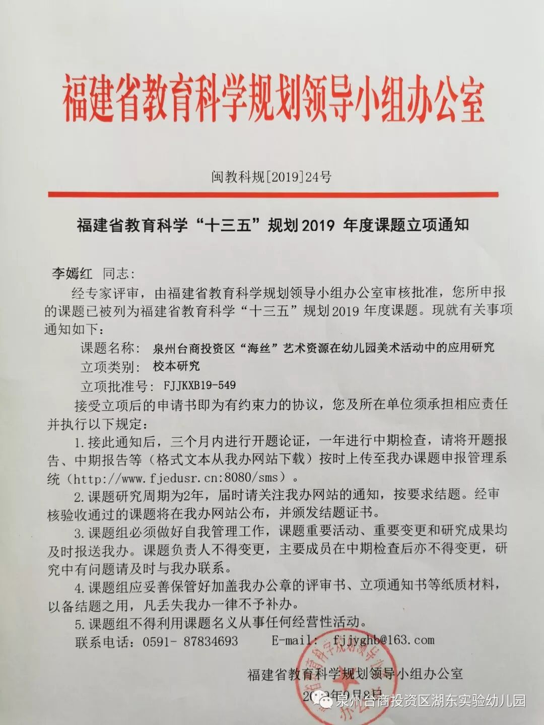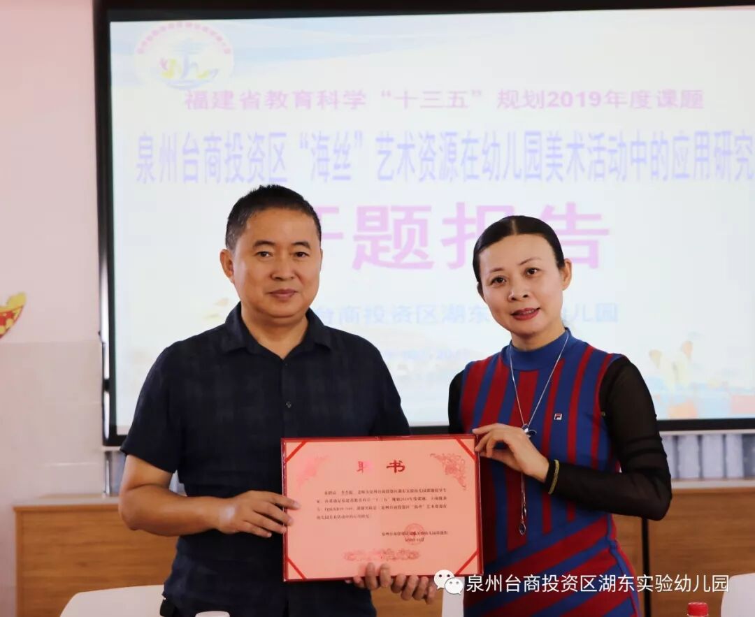 我园申报的课题《泉州台商投资区“海丝"艺术资源在幼儿园美术活动中的应用硏究》被福建省教育科学研究规划领导小组办公室批准立项。开题论证会上,首先,福建省教育科学研究所教育发展研究室冯云主任宣读了“福建省教育科学“十三五”规划2019年度课题立项通知”,并充分肯定我园对课题研究的高度重视。