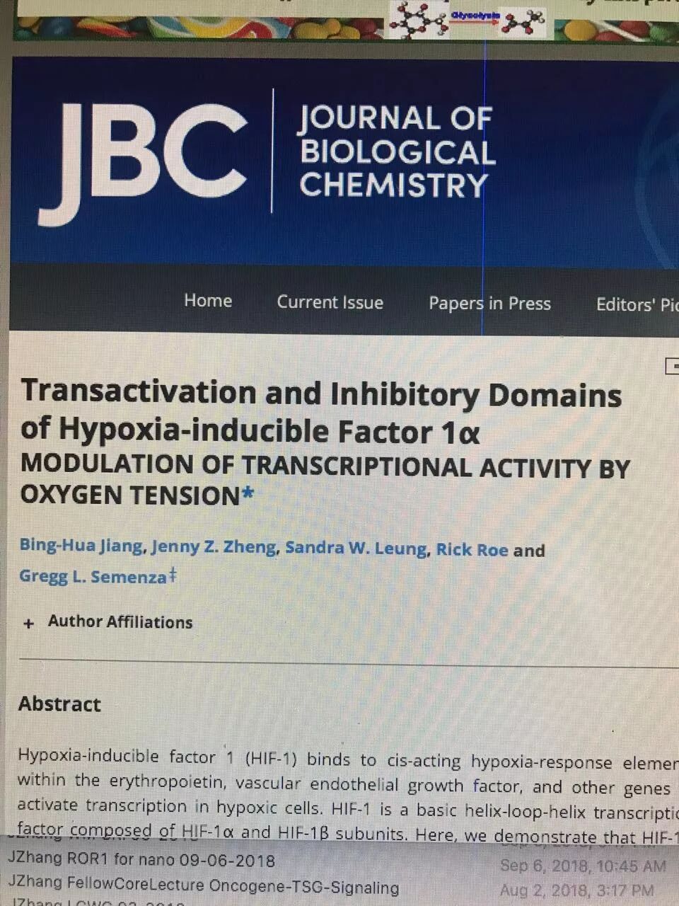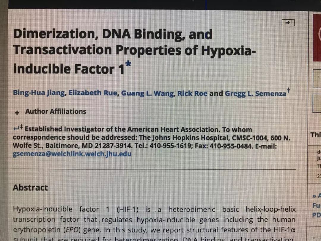 值得一提的是,在诺奖官方提供的五篇核心文献中,一篇Semenza(塞门扎)参与的关于克隆低氧诱导因子(HIF)蛋白的文章,第一作者为华人学者王广良。论文还有一位作者,署名是JiangBH(中文名江秉华)。