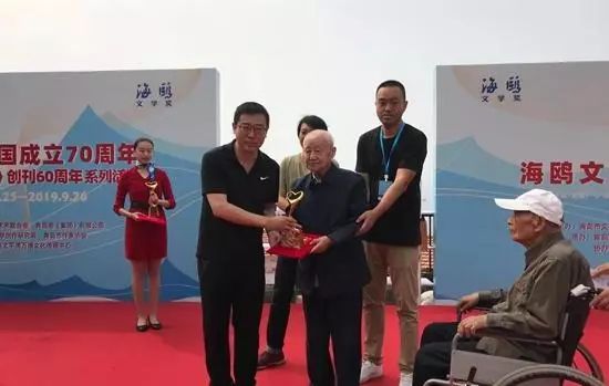 《中国作家》杂志主编程绍武代表评委会为年逾九旬的文学工作者耿林莽和刘禹轩颁发编辑创作终身成就奖