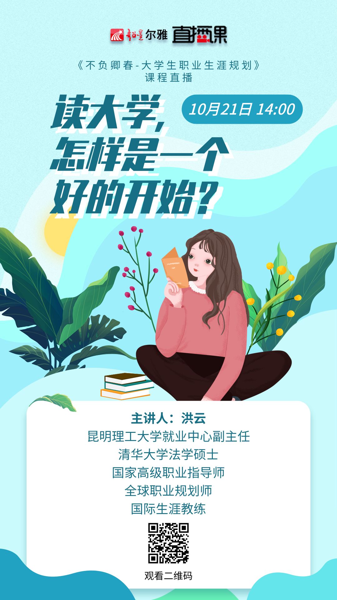 10月21日下午14:00,昆明理工大学洪云老师将带你认识读大学的深刻意义,为你讲述如何读大学才能不负卿春。