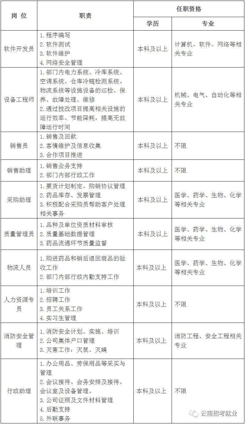 一、公司简介云南省医药有限公司是云南白药集团的全资子公司,注册资本7亿元,是云南省规模最大、综合实力最强的大型医药流通企业。2017年销售额163.4亿元(不含税),排名云南省第1位,全国医药流通百强企业第15位。行业影响力中国医药商业协会副会长单位全国医药行业思想文化建设协会常务副会长单位云南省药品流通行业协会常务副会长单位公司荣誉中国医药行业 “中国医药商业50强”中国医药行业 守法诚信企业中国医药商业行业 企业信用评价AAA级(最高等级)信用企业全国药品批发企业 药品物流服务能力AAA级(最高等级)企业中国药品流通行业 “十二五”最佳技术创新奖、“十二五”最佳创新特别奖中国药品流通行业 最佳对供应商服务奖、最佳对医疗机构服务奖、最佳物流管理创新奖、最佳质量管理创新奖、最佳信息化实践奖、最佳医药电子商务奖二、完善的薪酬福利体系1.薪资:试用期5000-5500元/月(研究生5000-6000元/月),转正后年薪6-7.2万元。2.福利:享受五险(国家规定险种及人身意外险);购买住房公积金、企业年金;年终奖金;传统节日礼品;丰富的团队活动等。3.住宿:提供员工宿舍(设施完善的2~4人套间公寓,独立卫生间,使用面积约70㎡)。4.用餐:用餐补贴10元/工作日(公司内部食堂提供中式菜品、西式甜点、地方特色美食,早餐仅需1~3元,午餐、晚餐仅需4~8元)。5.休息休假:实行8小时工作制;带薪年休假、探亲假、婚假、产假等。6.培训:入职培训、岗位培训;老师指导、职业生涯规划指导等。三、招聘需求列表