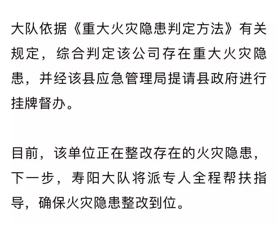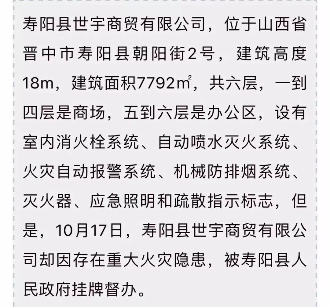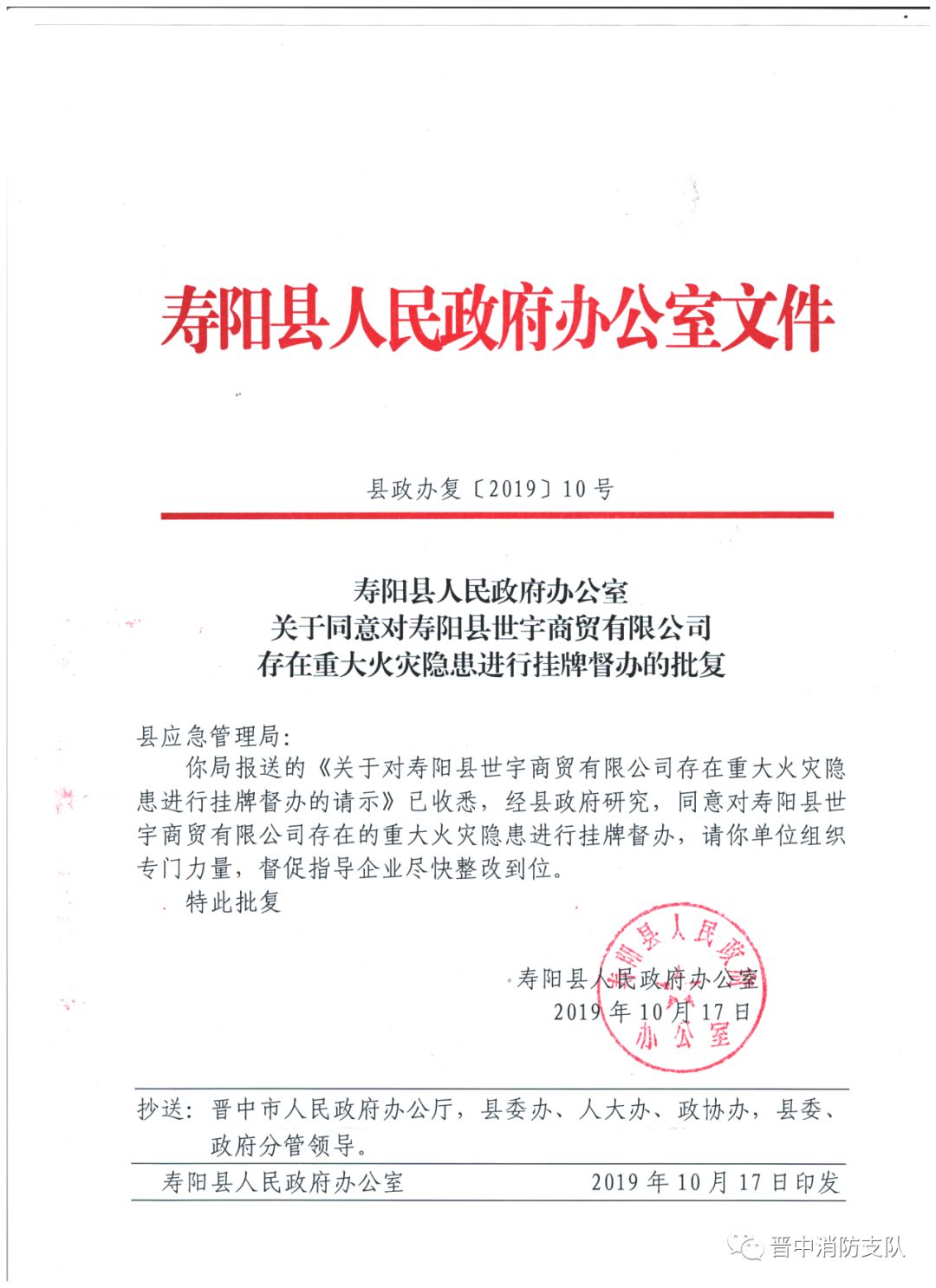 寿阳县世宇商贸有限公司重大火灾隐患被挂牌督办