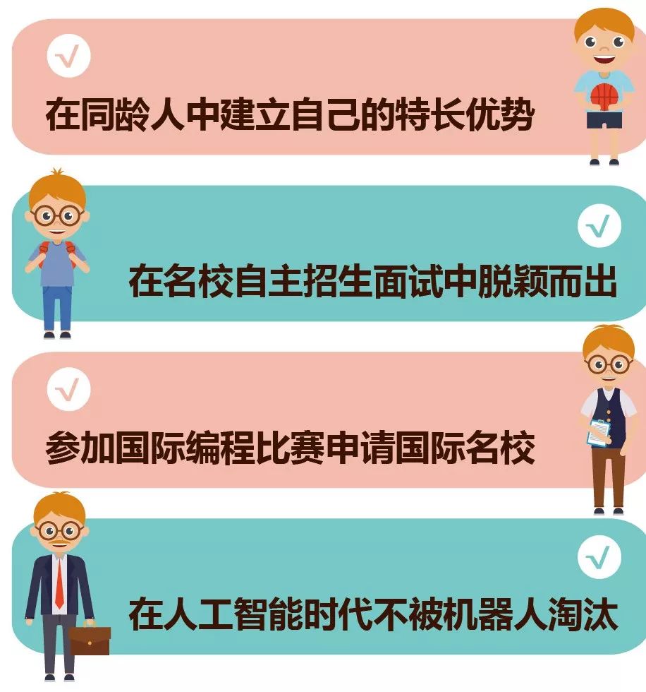 因为教育部有令,将在中小学开设人工智能相关课程北大指出将设立“机器人工程”本科专业,“机器人特长生”可直接保送北大;很多城市早已把编程纳入中高考,在信息学竞赛中获奖的学生,更受名校自主招生的青睐。