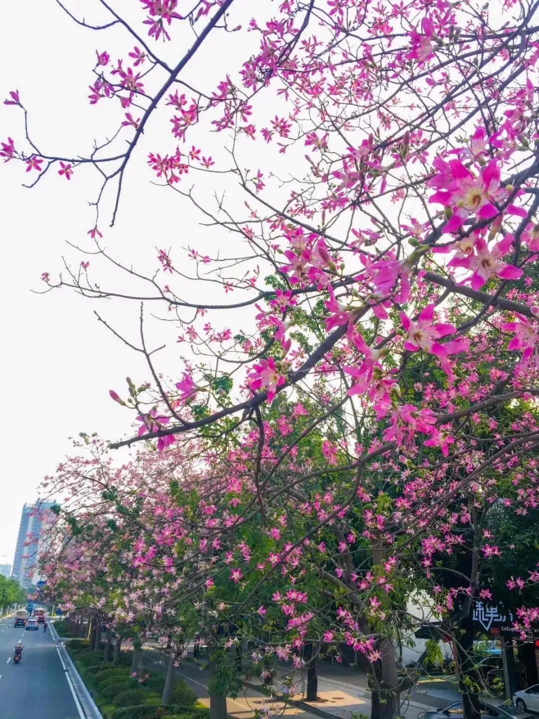 紫红的木棉花一团团绽放枝头或与蓝天相互点缀或与楼房互为映衬▼