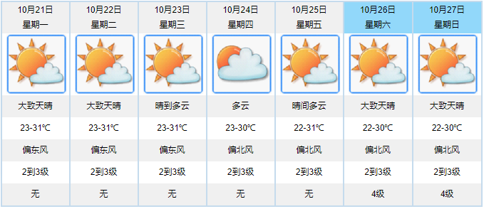 今晚到明天晴朗持续,气温23到31度。