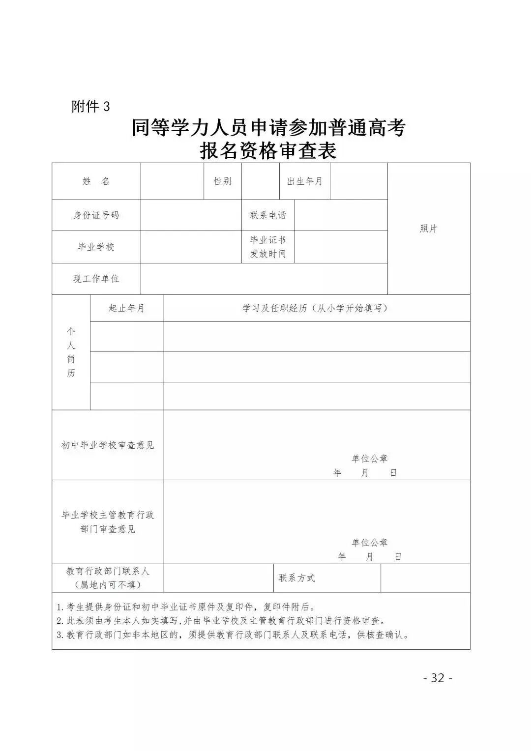 以同等学力身份参加普通高考的考生,普通高考报名时必须是初中毕业满三年以上(2016年及以前取得的毕业证书),并填写《同等学力人员申请参加普通高考报名资格审查表》。经审查合格后,考生凭户口簿、居民身份证、《同等学力人员申请参加普通高考报名资格审查表》参加高考报名。《同等学力人员申请参加普通高考报名资格审查表》必须是县(市、区)级或以上教育行政部门审核确认的。