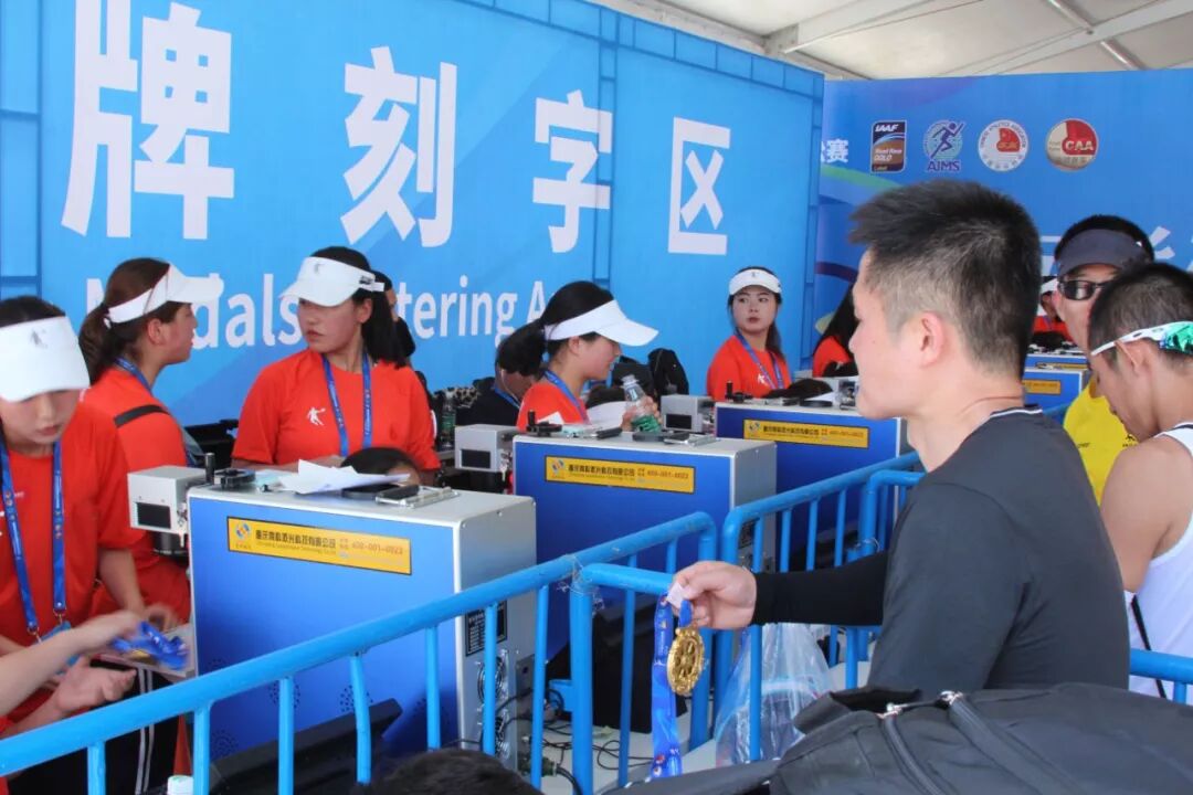 奖牌背面则以蓝色象征临沂母亲河——沂河,以水元素来表达,印刻在奖牌的背面,凸显出临沂厚重的历史文化与临沂人坚实的精神支柱。同时现场也为临马完赛选手提供免费奖牌刻字、号码布塑封服务,让奖牌和号码布更具纪念意义。