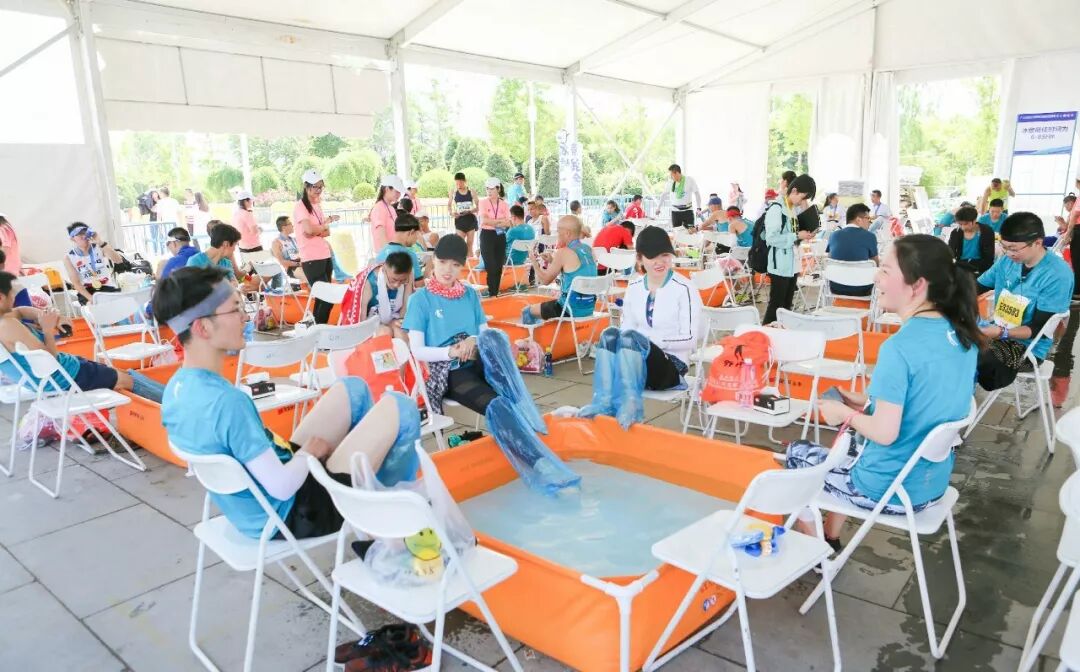 在赛后恢复区设有冰敷区及按摩拉伸区,提供规范、专业和贴心的赛后恢复服务。跑者们在赛后会出现肌肉、关节和脚掌有酸痛和疲惫感,使用冰敷等冷疗法来进行赛后恢复,就可缓解疼痛与肿胀感。还有专业的拉伸及按摩服务帮助跑者排酸、缓解肌肉紧绷。温馨提示:6到8分钟之间是理想的冰敷时间哦!