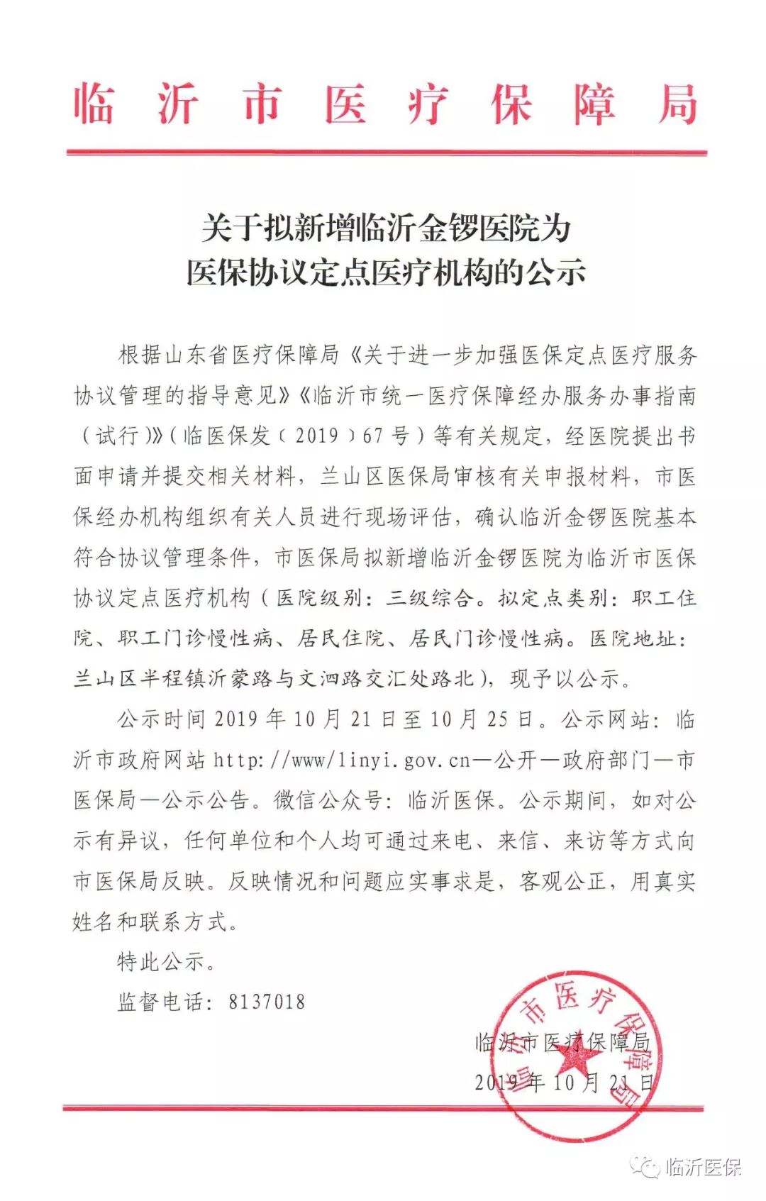 关于拟新增临沂金锣医院为医保协议定点医疗机构的公示