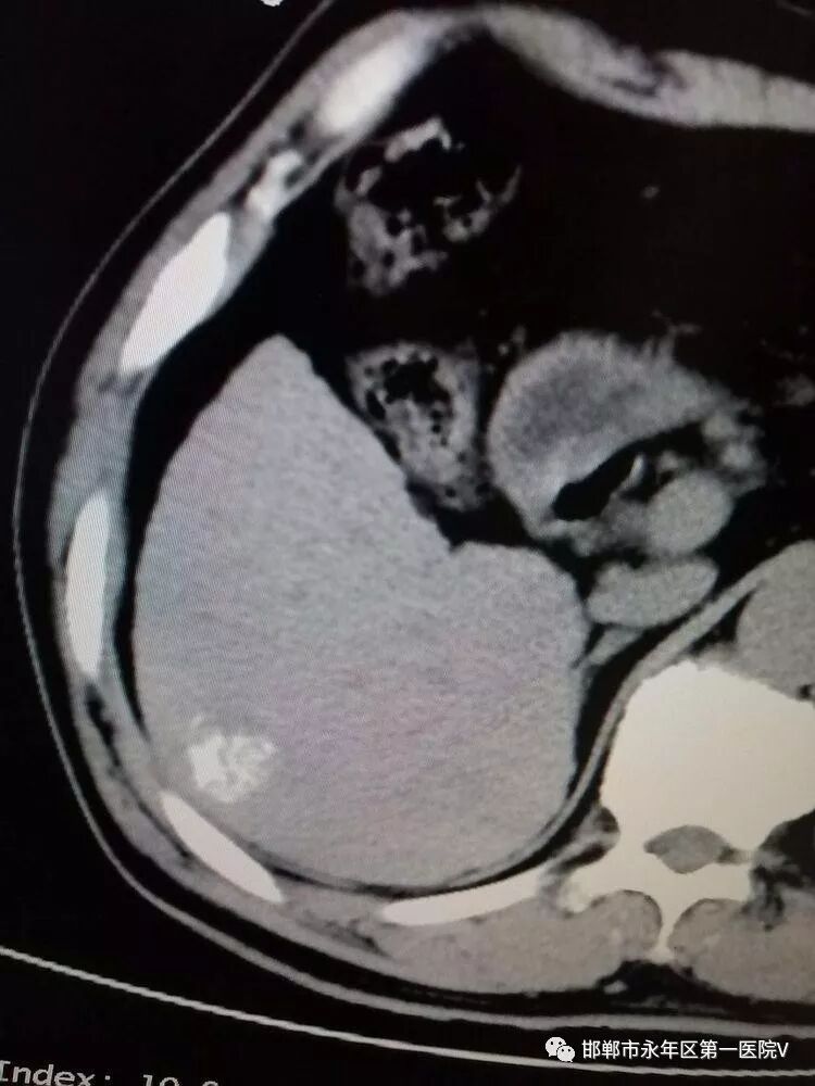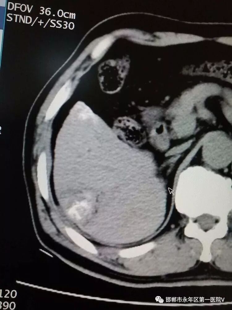 患者赵某,男,67岁,肝硬化病史4年,常规复查发现肝占位,约2.2*2.5cm,上腹部CT、MRI平扫及其增强均符合原发性肝癌典型表现,诊断明确!依据2017年中国原发性肝癌诊疗规范,肿瘤分期属|a期,根治性治疗可选择手术切除或者消融,永年区第一医院肝内科王书芳主任和家属充分沟通后,患者选择消融治疗!
