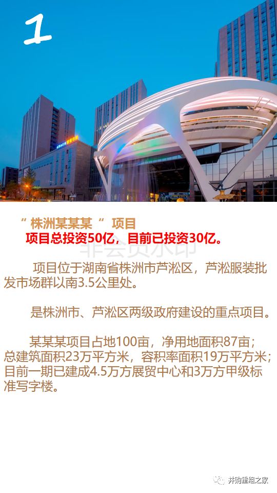 1、项目位于湖南省株洲市芦淞区,芦淞服装批发市场群以南3.5公里处。是株洲市、芦淞区两级政府建设的重点项目。项目占地100亩,净用地面积87亩;总建筑面积23万平方米,容积率面积19万平方米;目前一期已建成4.5万方展贸中心和3万方甲级标准写字楼。