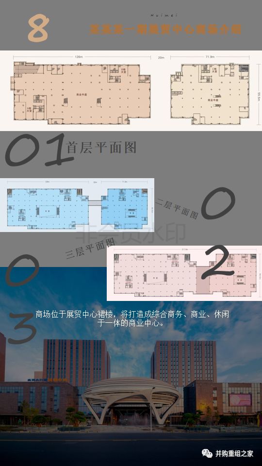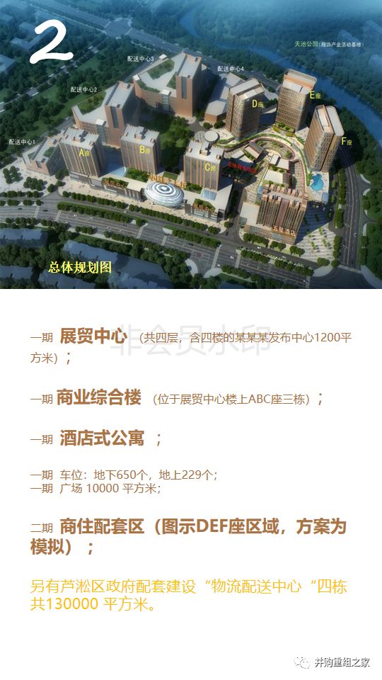 2、一期展贸中心 (共四层,含四楼的小巨蛋发布中心1200平方米); 商业综合楼 (位于展贸中心楼上ABC座三栋); 酒店式公寓 ;车位:地下650个,地上229个;广场 10000 平方米均已建设完毕。