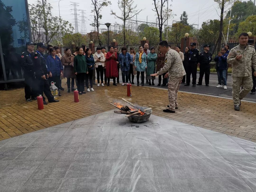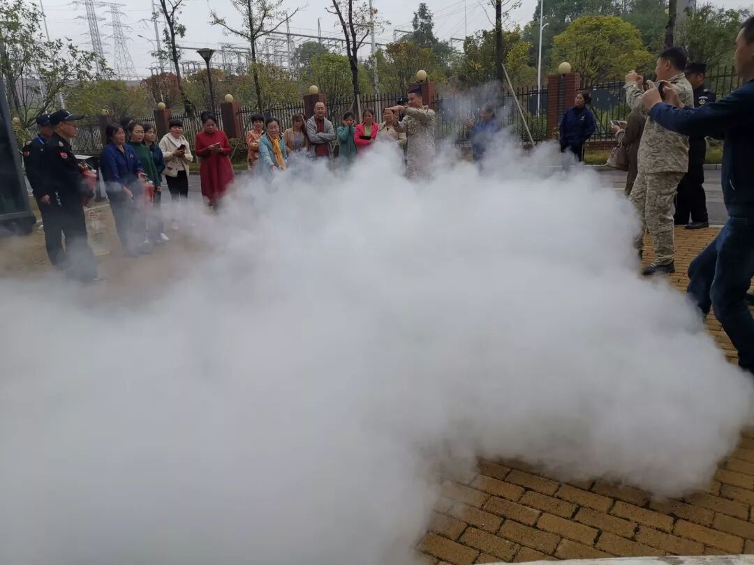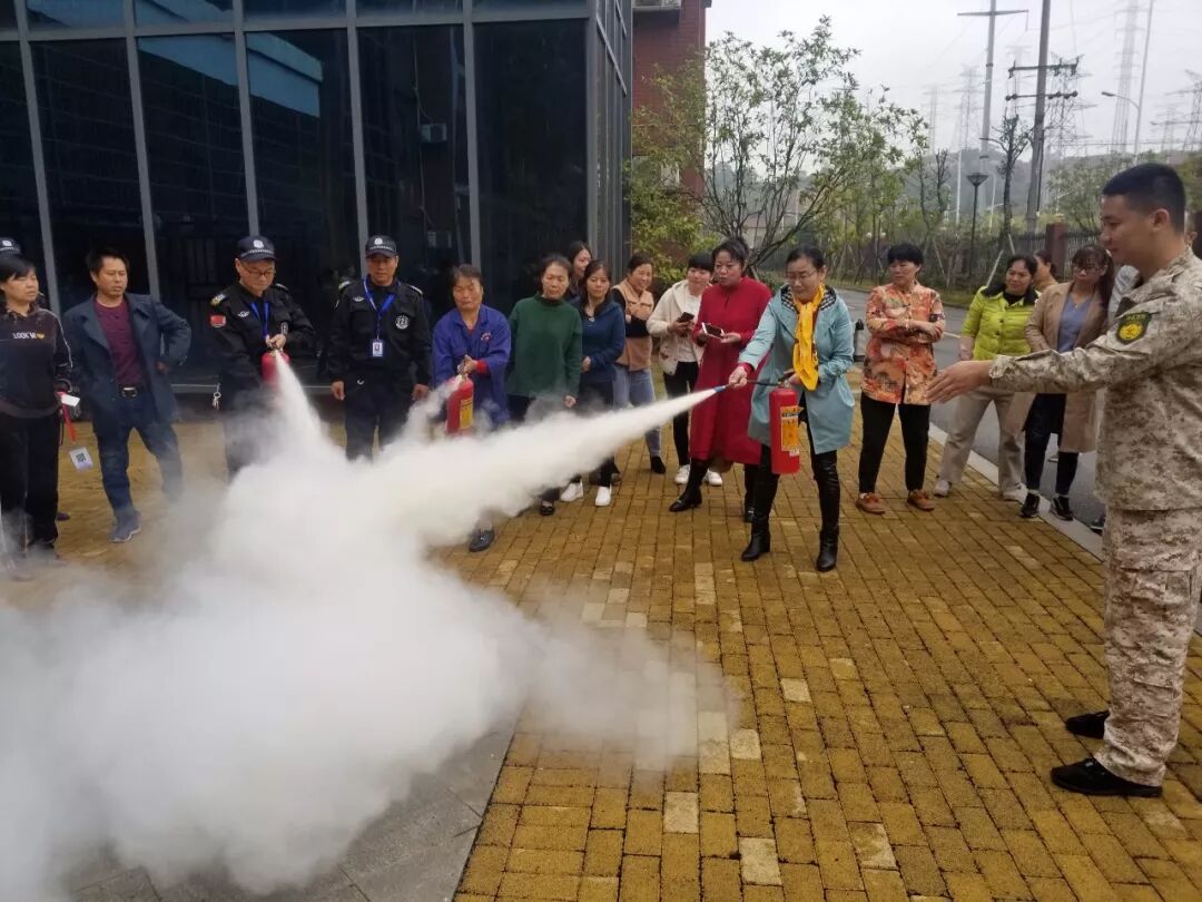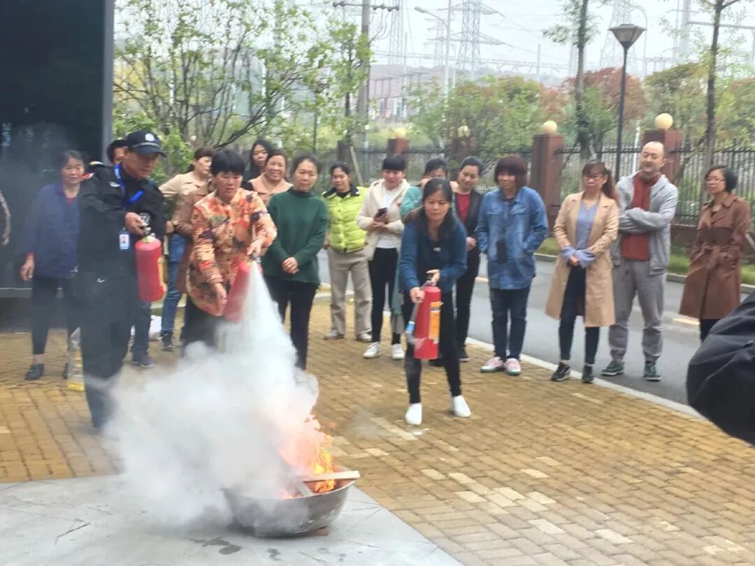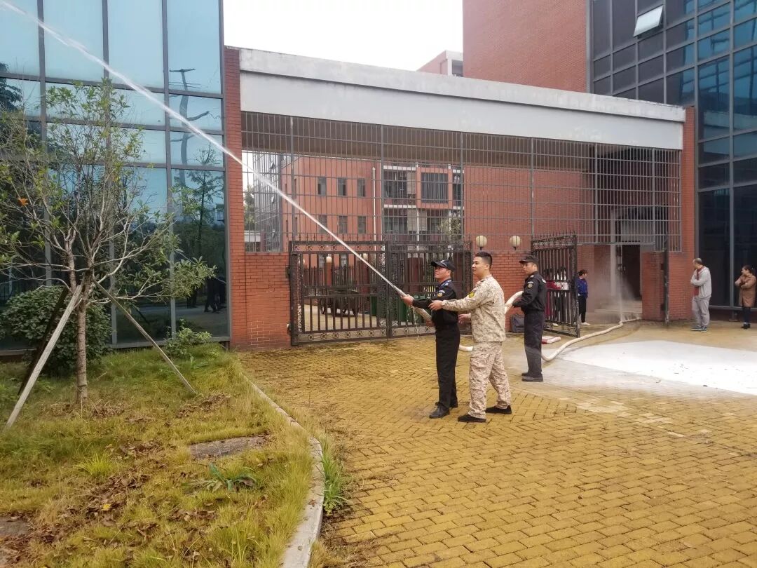 随后,在学生公寓旁,宣教员还组织进行了火灾现场模拟,指导保安、宿管员、实验员、后勤人员进行灭火。他们一丝不苟地按照步骤要求:摇动灭火器→拔出保险销→左手握喷管→右手提压把→在距火焰两米的地方,压下压把,拿着喷管对准火焰根部,左右摇摆覆盖燃烧区,直至把火全部扑灭。老师们迅速掌握了灭火的技巧,提高了应急应对能力。