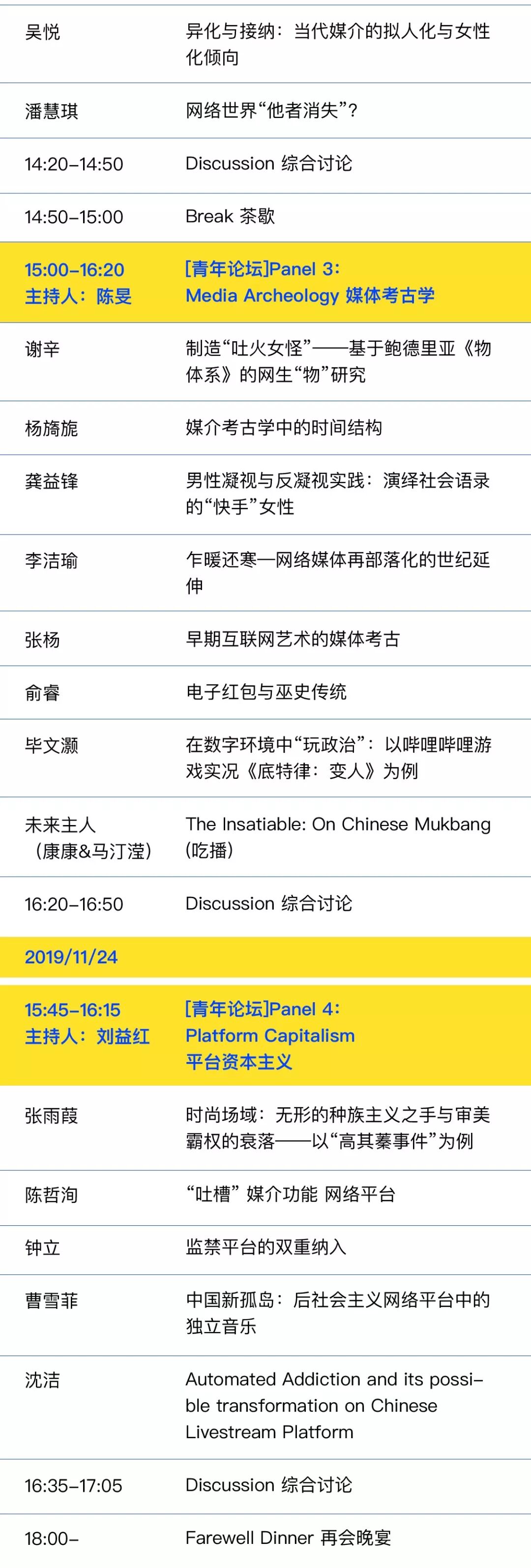 Panel 3: Media Archeology"New media" seems old-aged to contemporary media study. Criticism of social media largely comes from authors outside the academy like some outstanding journalists, old hippies who are close to the Silicon Valley but in a critical distance, or few hackactivists. The production of academic research and theory is left far behind; software study has not yet dominated the stage. From Marshall McLuhan's performative and manifesto-like confession, to the research approach proposed by Matthew Fuller et al.——evil media, a self-driven media that has nothing to do with the spectator——have we found the possibility to overcome? Is media archeology a way out? Could we understand how Wechat Friends' Circle and Kwai work as we see Tianya Club or Rongshuxia (Tianya is an internet forum and Rongshuxia is a portal site of internet literature. Both were founded in late 1990s in China.)? Or maybe we should think conversely that only through the analysis of the current we would realize the meaning of the past. As Marx said: "Human anatomy contains a key to the anatomy of the ape. The intimations of higher development among the subordinate animal species, however, can be understood only after the higher development is already known." Then, what did we miss and misunderstand when the internet emerged?