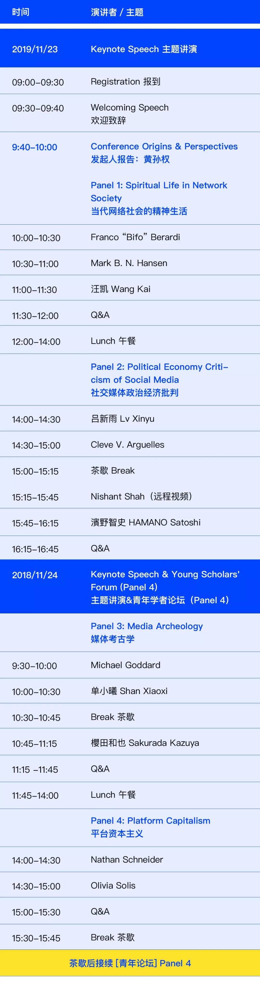 我们的工作、生活,甚至情感交流,都被掌握技术工具的中介者(mediators)所占有了。平台就是媒体、市场与公司,并作为统治者,观看着透明笼子中人类现在与未来的生活。平台接管了社群制造,埋葬了独立媒体,安利化博客、工具化了网民。在全面的社会加速中,我们必须越跑越快才能停在原处。漂泊狂想曲(precarious rhapsody)可以成为共鸣嘛?线上社群能够成为像合作社一样的存在吗?社会运动可以超越魔兽的公会力量?社交媒体的深渊无法跨越?报告人:吕新雨(华东师范大学传播学院院长)濱野智史(日本社会学家、批评家)Cleve V. Arguelles(澳大利亚国立大学克罗贝尔亚太事务学院政治与社会变革系)Nishant Shah(阿尔特兹艺术学院研究院副主席)