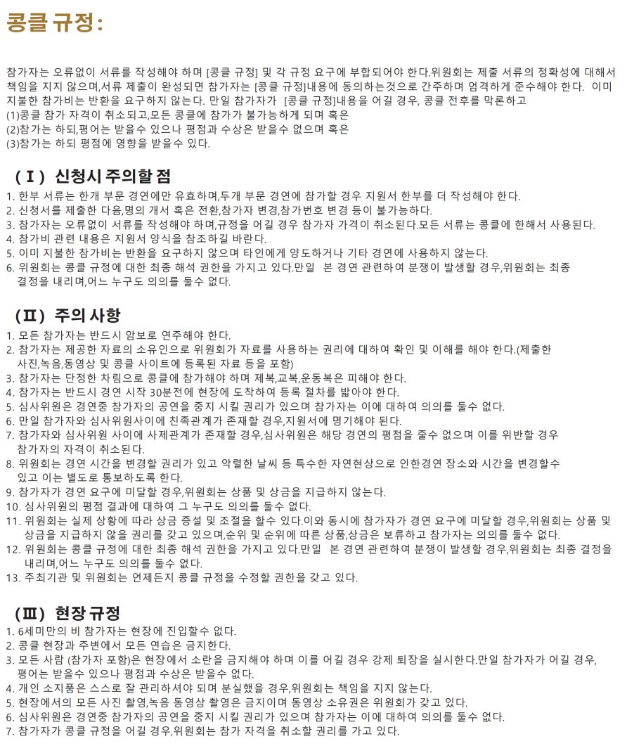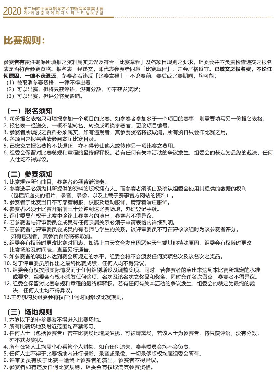 不限年龄,韩中两国选手均可参赛。自选一首韩国作品完整演奏。(8分钟以内)