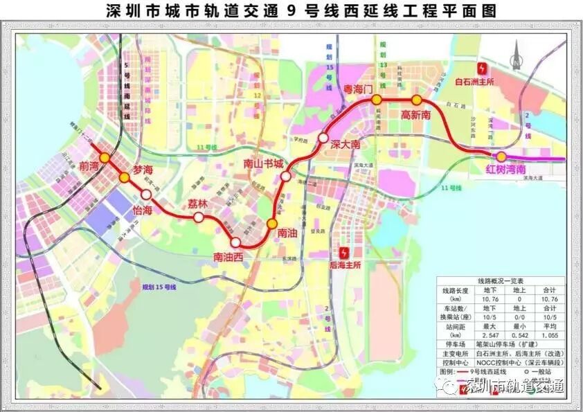 地铁9号线西延线深入南山中心区和前海自贸区,西起前湾站(与5号线南延线换乘),东至红树湾南站,全长约10.8公里,共设10座车站,其中5座换乘站。预计今年年底开通初期运营。