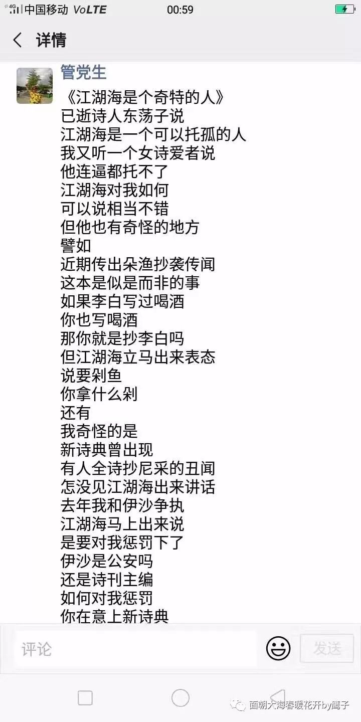 按照《新诗典》的要求,每位有作品入典的作者都要提供一份个人简历和照片。然而,读者们可以看看本文后面附的——这所谓的江湖海“个人档案”不仅没有一句跟“个人简历”有关的话,反而通篇都是如何恭维取悦《新诗典》主编伊沙的文字。在此,单单是从专业角度来讲,这样的“个人简历”是要给零分的;如果从诗人的节操,以及“情绪控制上”来讲,这不免让人想到中学课本里“范进中举”的故事!我想,即便是莫言获得2012年诺贝尔文学奖的时候也没有像你江湖海这样失态过吧!你不懂得个人档案怎么写,我可以免费教你。你要是得了诗人们通常犯的名利欲软骨病,跪舔病,立志要成为一个溜须拍马者,我劝你立刻退出诗坛,请别再给风气浮躁的诗坛再添一股不正之风!