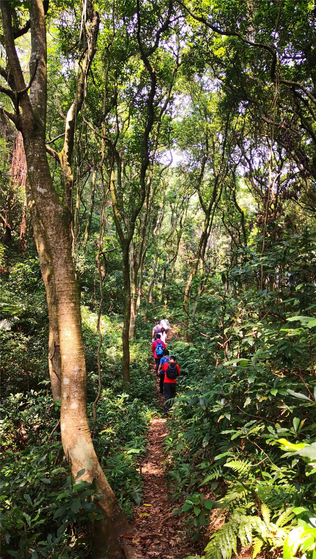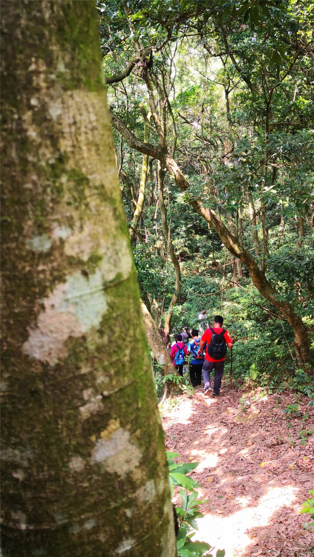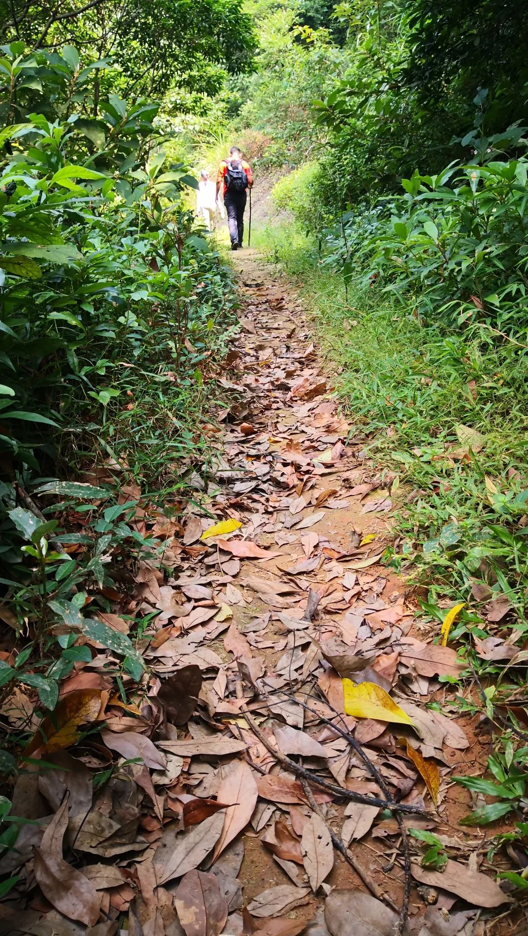 原始的泥路,铺盖着落叶层,走在上面软软的像铺了地毯,沙沙作响,当大家不说话时,静静的聆听树林里的各种声音,虫鸣鸟叫,风拂过树叶的声音,脚步踩在落叶上的声音,时间就在这之间悄然流逝。