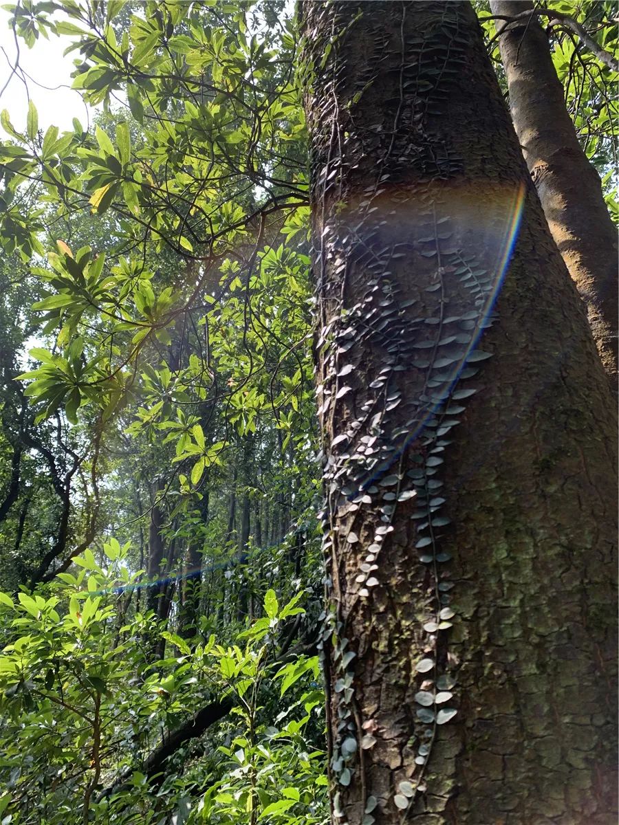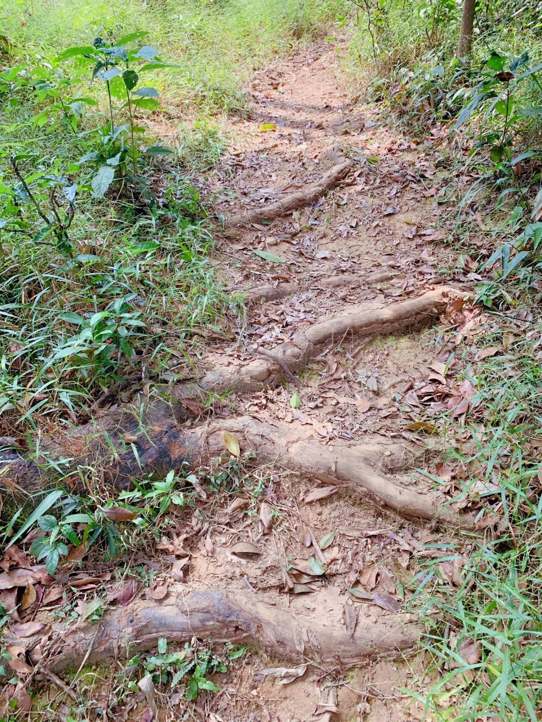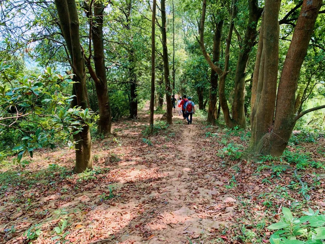 原始的泥路,铺盖着落叶层,走在上面软软的像铺了地毯,沙沙作响,当大家不说话时,静静的聆听树林里的各种声音,虫鸣鸟叫,风拂过树叶的声音,脚步踩在落叶上的声音,时间就在这之间悄然流逝。