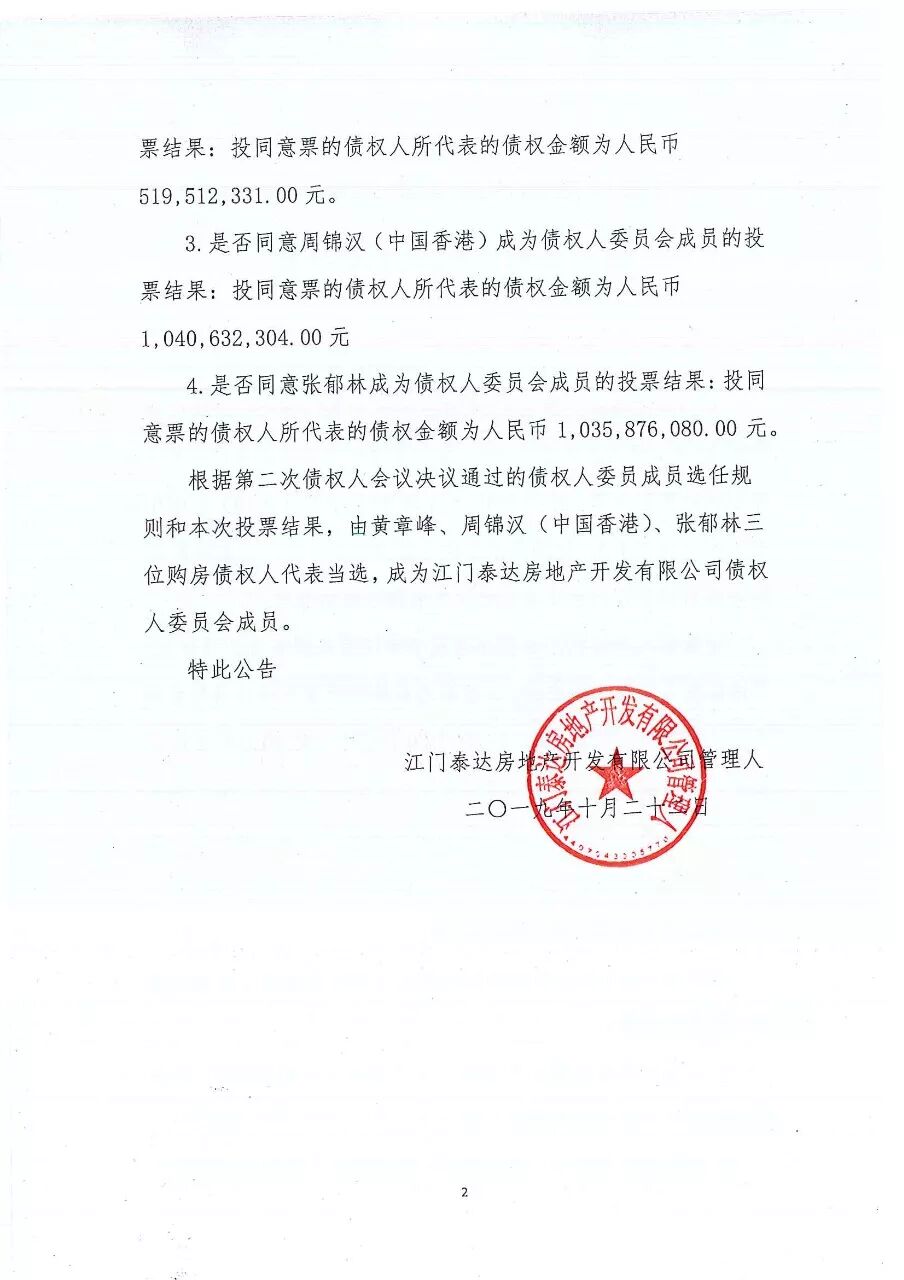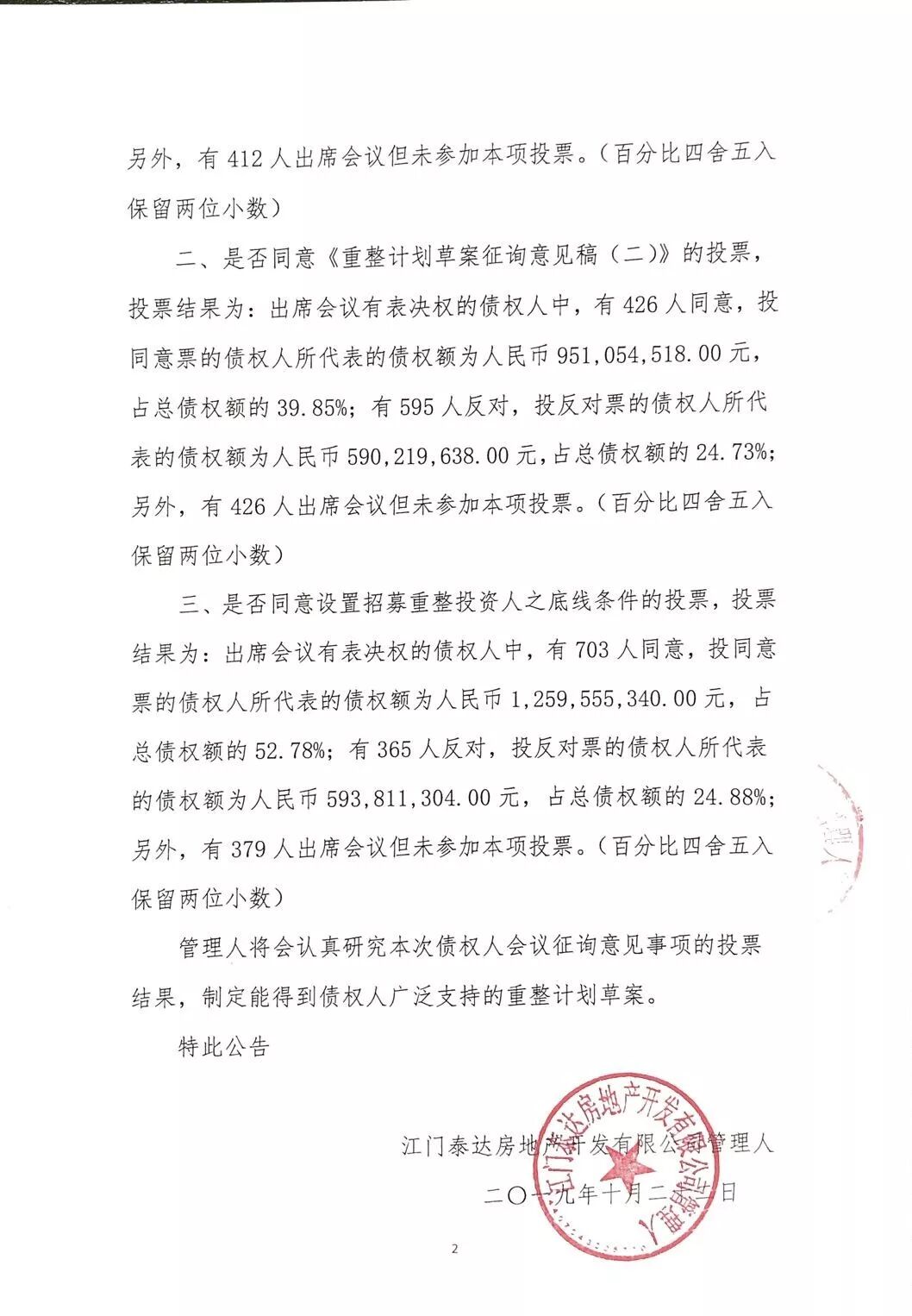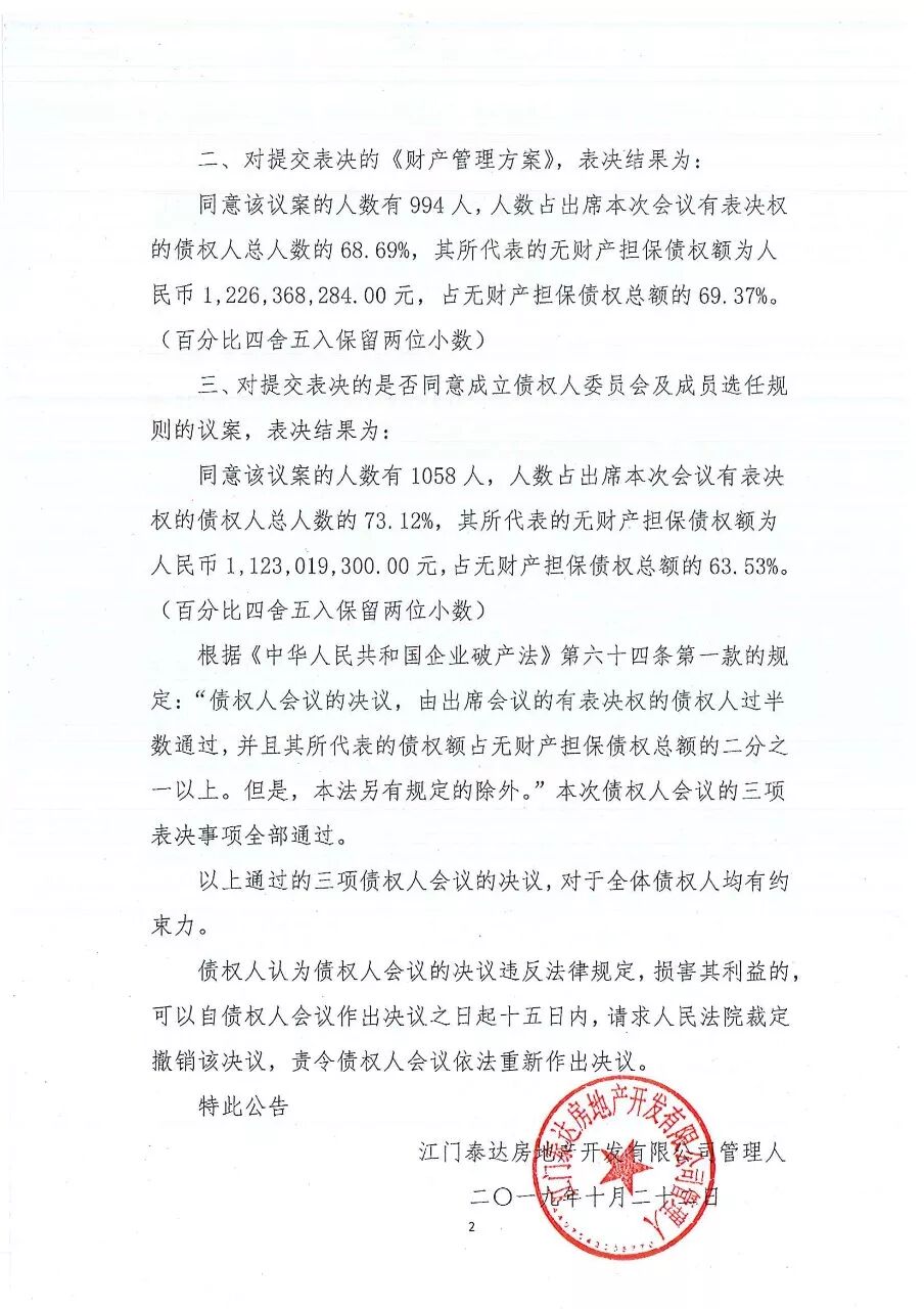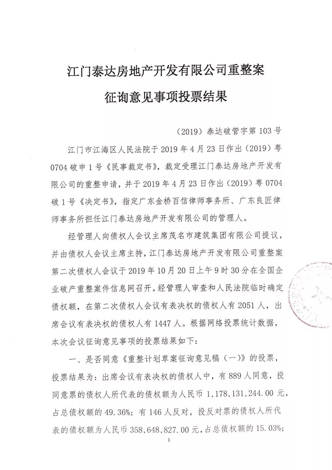 2、江门泰达房地产开发有限公司重整案征询意见事项投票结果;