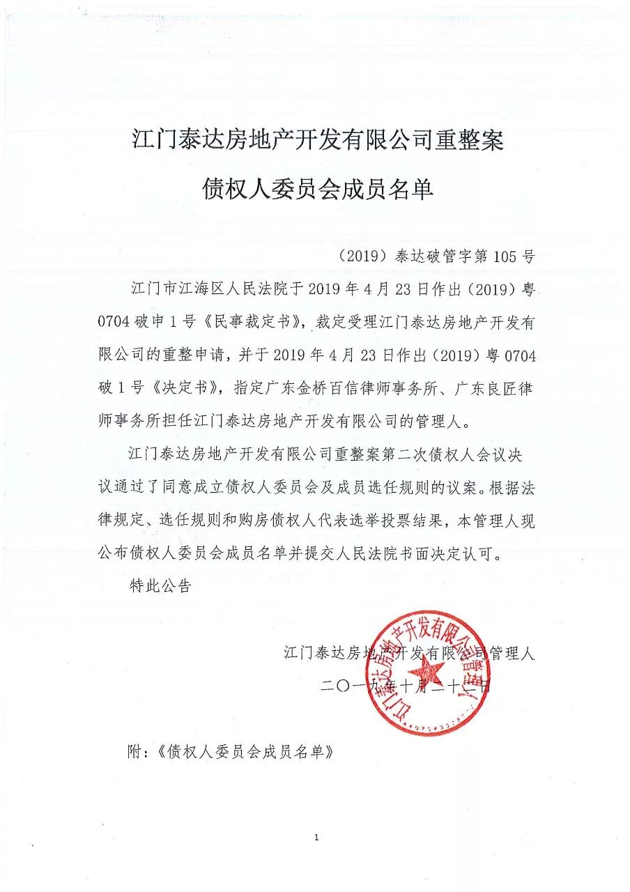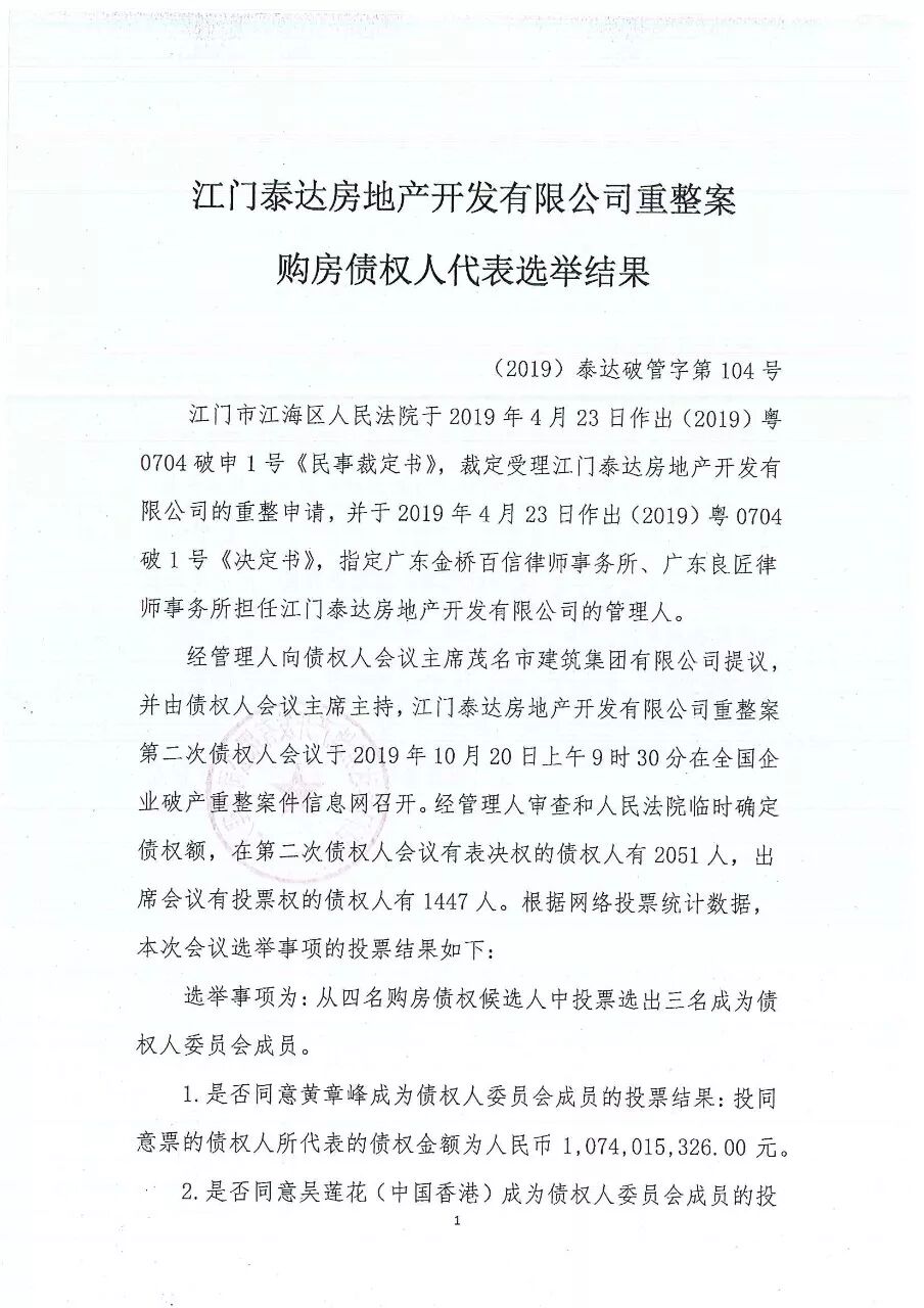 3、江门泰达房地产开发有限公司重整案购房债权人代表选举结果;