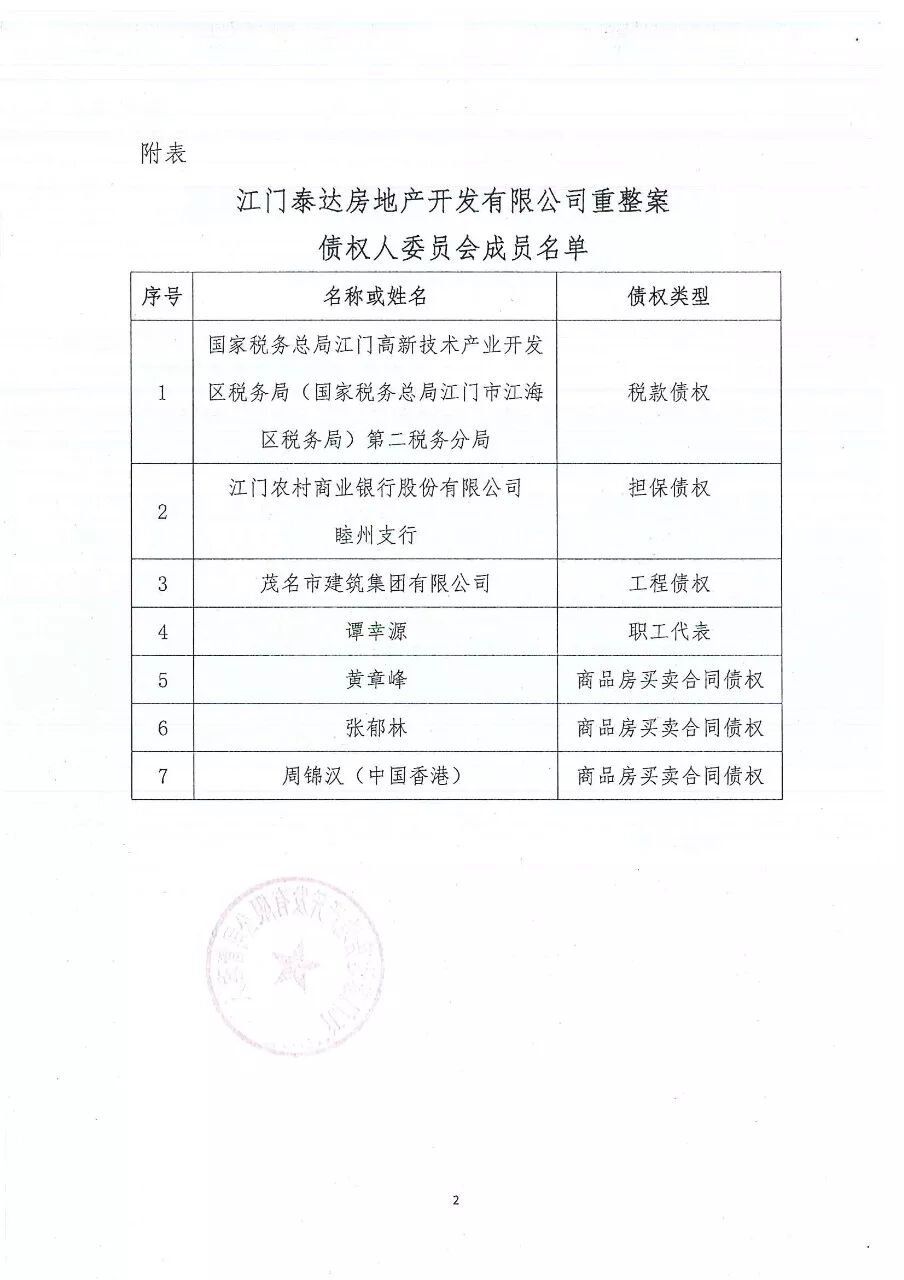 1、关于江门泰达房地产开发有限公司重整案第二次债权人会议决议的公告;