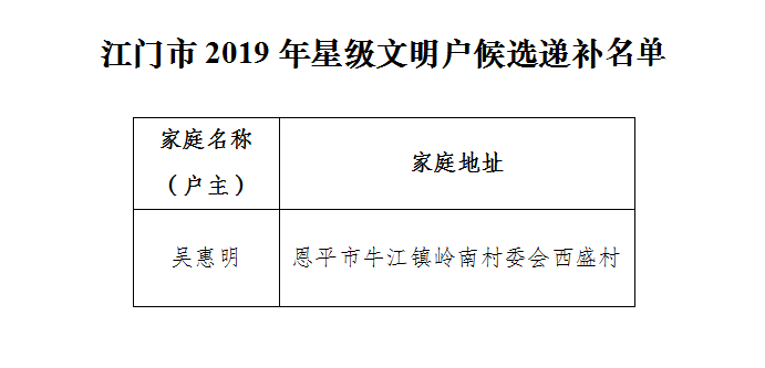 2019年10月9日至15日,江门市文明办对江门市2019年星级文明户300户候选名单进行了公示。公示期间,发现有1户不符合评先评优条件。经评审会研究决定,由吴惠明家庭递补进候选名单。为体现公开、公正、公平的原则,现予以公示(名单附后)接受社会监督。1.公示时间:2019年10月21日至25日止。2.在公示期限内,个人和单位均可通过来信、来电、来访等形式反映公示对象的情况和问题。以个人名义反映的提倡留真实姓名,以单位名义反映的应加盖本单位公章。反映情况和问题,要坚持实事求是原则,不得借机诽谤和诬告。3.受理单位:江门市精神文明建设委员会办公室地 址:江门市白沙大道西1号6幢邮政编码:529031联系电话:3272525传 真:3353967 江门市精神文明建设委员会办公室
