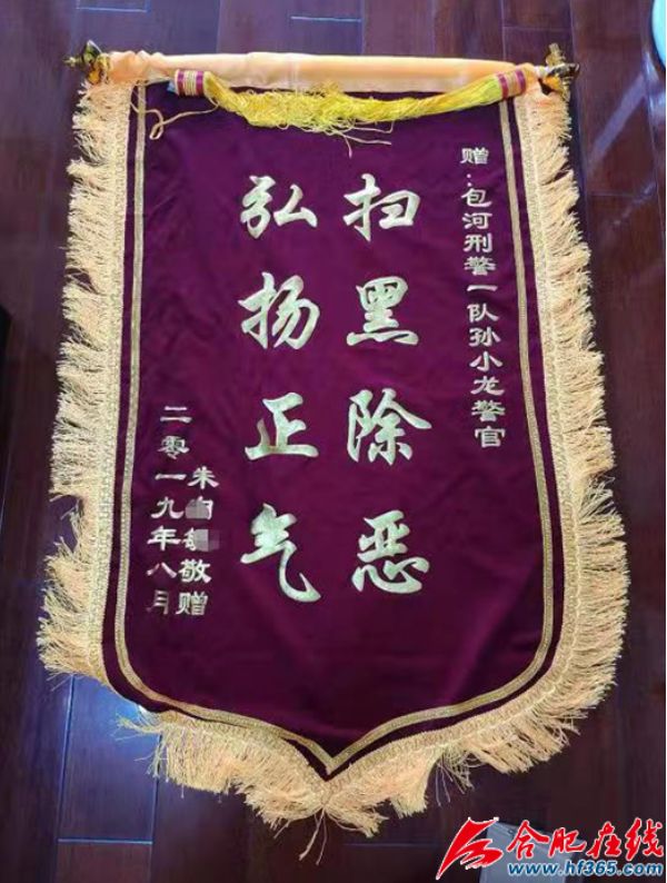 近日,合肥市公安局包河分局刑警一队就收到了这样一份“特殊的快递”。寄件地址是江苏南京市栖霞区。他以为是自己老婆网上买的东西,也没太在意就抱回了家。谁知到家拆开一看,才发现竟是一面锦旗,上书“赠包河刑警一队孙小龙警官:扫黑除恶,弘扬正气!朱某某敬赠,2019年8月”。原来是朱某某,一桩涉恶案件的受害人!想到此案件,孙小龙不禁陷入回忆中。>>点击查看详情(包公新 合肥在线记者 王晓峰)