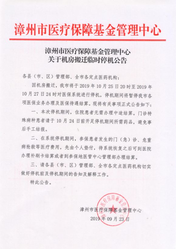各县(市、区)管理部、全市各定点医药机构:因机房搬迁,我市将于2019年10月25日20时至2019年10月27日24时对医保系统进行停机,停机期间将暂停我市各项医保业务办理及医保待遇结算。现将有关事项正式公告如下:一、本次停机期间,住院患者无需办理中途结算。门诊特殊病种患者请于10月24日前开足停机期间所需药品,避免事后手工结报。二、在系统停机期间,参保患者发生的门(急)诊、危重病抢救等医疗费用,先由个人垫付,待系统恢复之后可到医院办理补刷卡结算或者到参保地医管中心管理部办理结算。三、请各县(市、区)管理部、全市各定点医药机构切实做好停机前及停机期间的告知及解释工作。特此公告。