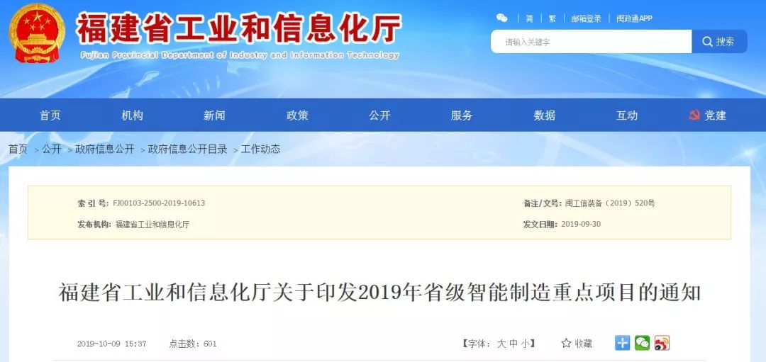 闽工信装备〔2019〕520号各设区市工信局、平潭综合实验区经发局,省属集团(控股)公司,有关行业协会: 为推动我省智能制造发展,促进产业转型升级,我厅组织编制《2019年省级智能制造重点项目》,现印发你们,请你们认真组织实施。 一、加强项目管理服务。2019年省级智能制造重点项目共计221项,请各设区市做好项目协调、服务工作,加强政策宣导,及时协调解决项目实施过程中存在的困难和问题,推进项目按计划实施,充分发挥项目社会效益和经济效益。 二、做好项目分类指导。2019年省级智能制造重点项目主要包括智能制造试点示范企业与样板工厂(车间)项目、智能制造系统解决方案供应商项目、首台(套)重大技术装备保险补偿项目、首台(套)重大技术装备认定项目、重大短板装备项目等5种类型。各设区市应根据各项目申报指南要求,做好项目申报的指导工作。 三、优先给予政策支持。入选项目原则上是省级智能制造相关项目的重点支持对象,同时也作为本年度申报国家相关项目的优先推荐对象。地方配套政策对省级智能制造重点项目给予优先支持。 福建省工业和信息化厅