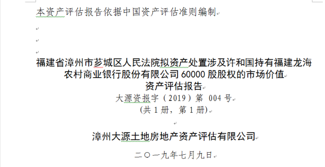 拍卖标的:许和国所有的60000股福建龙海农村商业银行股份有限公司的股权