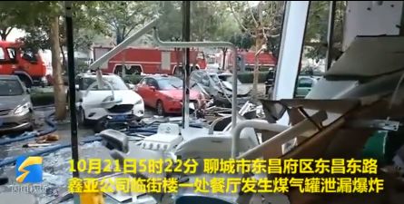 2019年10月21日05时22分,接群众报警称:聊城市东昌府区东昌东路鑫亚公司临街楼一处餐厅发生煤气罐泄漏爆炸。东昌府区公安、消防、应急、卫生等相关部门迅速到达现场进行救援,事故造成6名人员受伤,已送往医院救治,现场排查救援和事故调查工作正在同步进行。