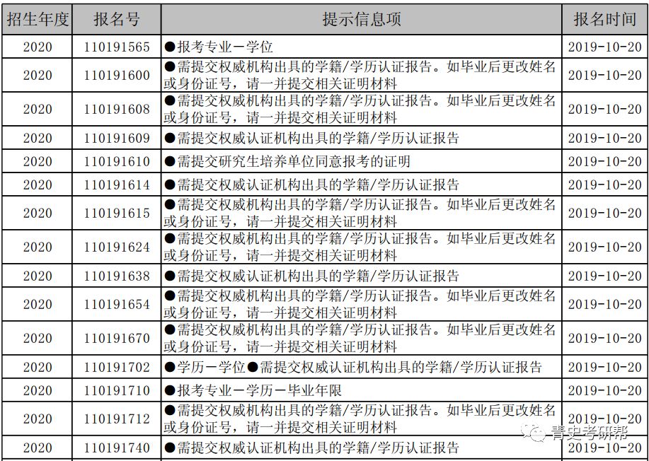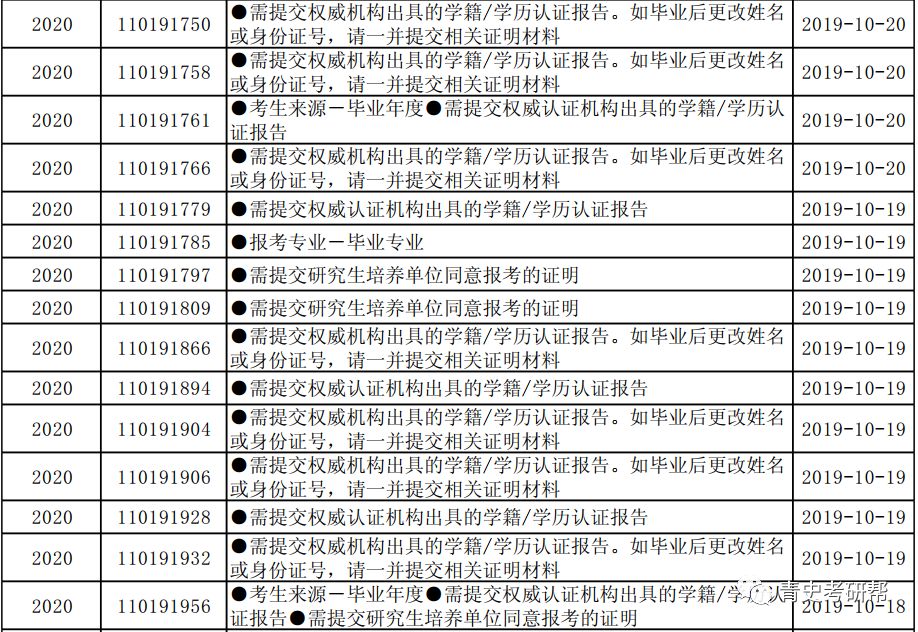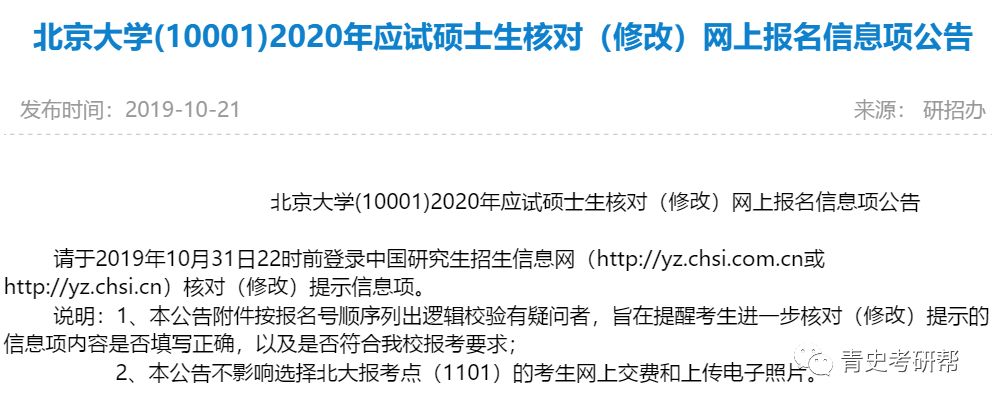昨日,北京大学发布了2020年考研报名核对(修改)网上报名信息的通知,通知显示考生初试报名信息存在需要核查、检验、修改的有很多,据版主统计,大概有近2000人。这其中极有可能包含今年报考北京大学历史学的同学,希望大家可以查询一下自己的报名信息,存不存在问题。