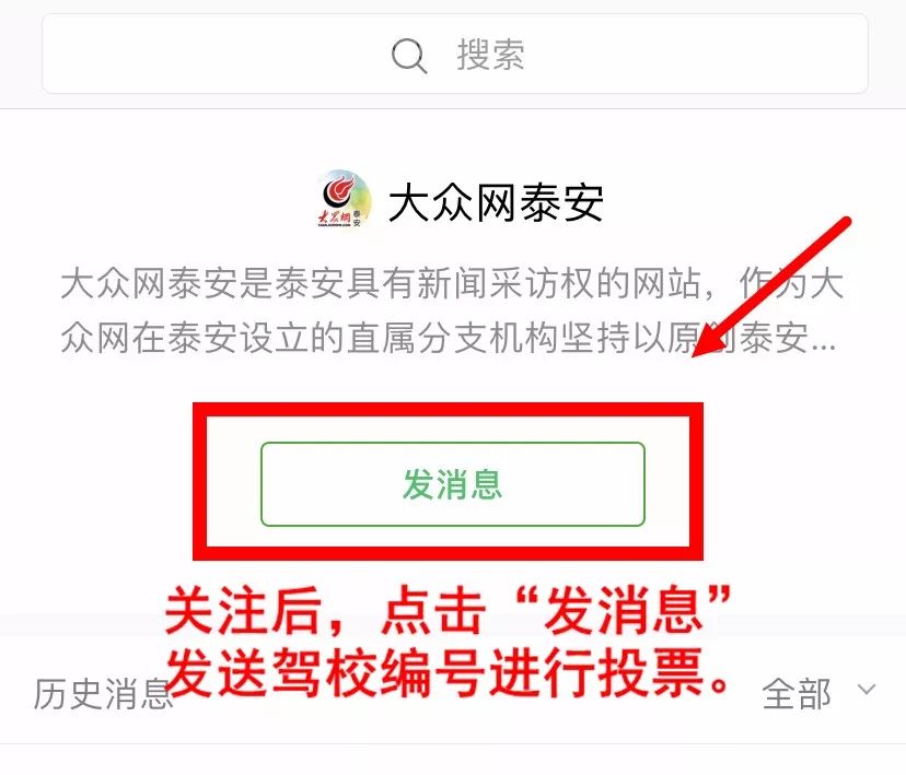 2. 进入“大众网泰安”微信公众平台页面。点击“十佳驾校评选”查看参选驾校名单及编号。
