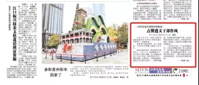 2017年9月22日《沧州日报》刊发的一篇题为《醉美遵义红》的文章传遍了整个遵义城——一名沧州游客送子到遵求学期间,旅游结缘遵义红旅集团全域旅游公司员工吴静,被其专业的知识储备和贴心、热情的服务打动,回沧后写下表扬信寄往遵义红旅集团全域旅游公司并在当地《沧州日报》发表散文《醉美遵义红》,讲述其在遵期间的见闻,字里行间表露出对遵义城景美人美,创文有序的夸赞。这篇文章在遵义当地引起了强烈反响,也让沧州染上了一抹遵义红 ,让遵义记住了沧州这座城。