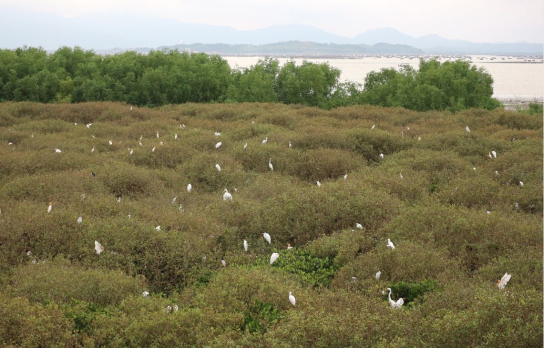 红树林因拥有密集且发达的支柱根而能在滩涂上深深扎根,并形成稳固的支架状,起到促淤保滩、防风消浪、护堤固岸的作用。凡有大片红树林的地方,就有如砌起了一道绿色的海上长城,牢牢护住了沿海百姓的身家性命,“海岸卫士”的称誉可谓实至名归。红树林还是“鹭鸟天堂”。作为世界上少有的物种多样化生态系统之一,且不说昆虫、鱼虾蟹、藻类等生物,也无需提及其它鸟类,单单鹭鸟,就已经让人惊艳。红树林里常见的鹭鸟有大白鹭、小白鹭、池鹭、牛背鹭、苍鹭、黄嘴白鹭、红头鹭等。日出日落时分,鹭鸟扑腾起落,或引颈或张翅,景象蔚为壮观,其生态效益,显而易见。除此之外,红树林还有“海水净化器”、“气候调节器”等美名,对促进近海渔业的发展,有着不可估量的巨大作用。有人赞美:“红树林—根的迷宫,防浪护堤的铜墙铁壁,天然的污水净化厂,海洋生物的伊甸园”,其热情洋溢的称颂,十分贴切。