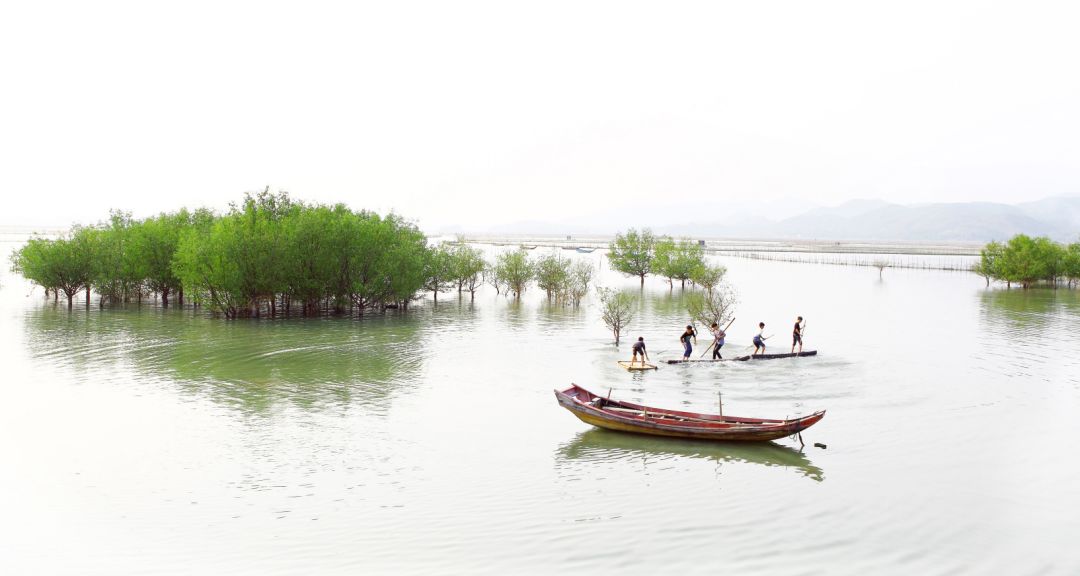 如今的红树林,俨然成了人们生态旅游的宠儿。大亚湾红树林公园,集观鸟、科普教育和湿地景观于一体。位于考洲洋内的内陆海岛盐洲岛,一改往昔的寂寥冷清,每到夏秋季节,成群结队的驴友、扛着“长枪短炮”的摄影发烧友,甚至还有拖家带口的旅人,踏足岛内,纷纷扰扰,惊起无数鹭鸟。有序的潮涨潮落中,澹澹碧波托着苍苍翠绿,红树林宠辱不惊,偶有成熟的棒状胚芽“笃”的轻声落入水中,或就地扎根,或随海水飘荡而去,从容淡定。